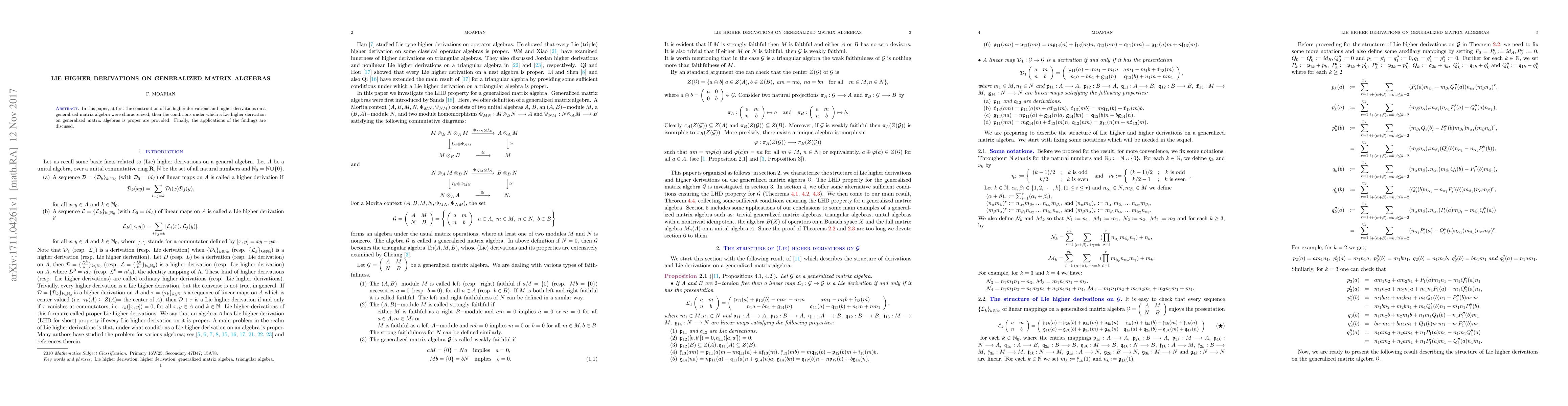 This paper characterizes the construction of Lie higher derivations on generalized matrix algebras and specifies conditions for these derivations to be proper. It concludes with discussions on the applications of these findings.