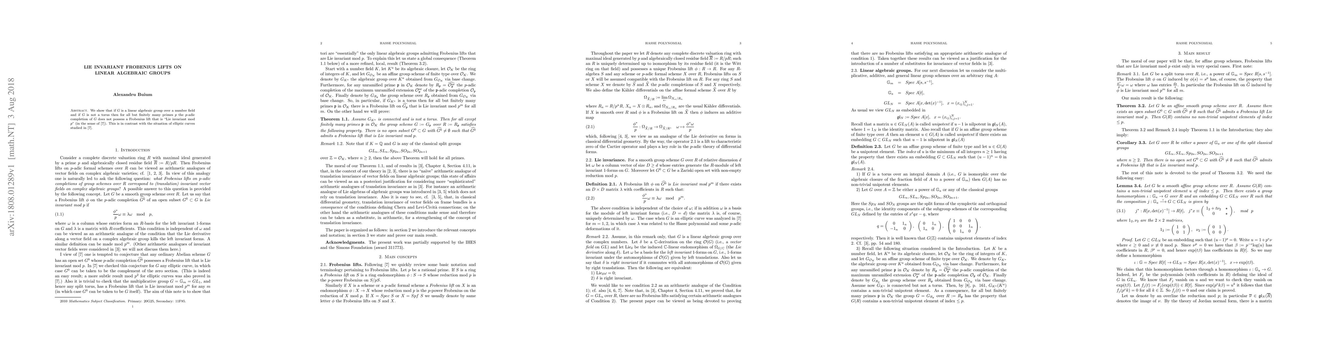 Summary: The paper demonstrates that for linear algebraic groups over number fields that are not tori, the $p$-adic completion lacks a Lie invariant Frobenius lift mod $p$ for all but finitely many primes $p$, contrasting with the behavior observed in elliptic curves.