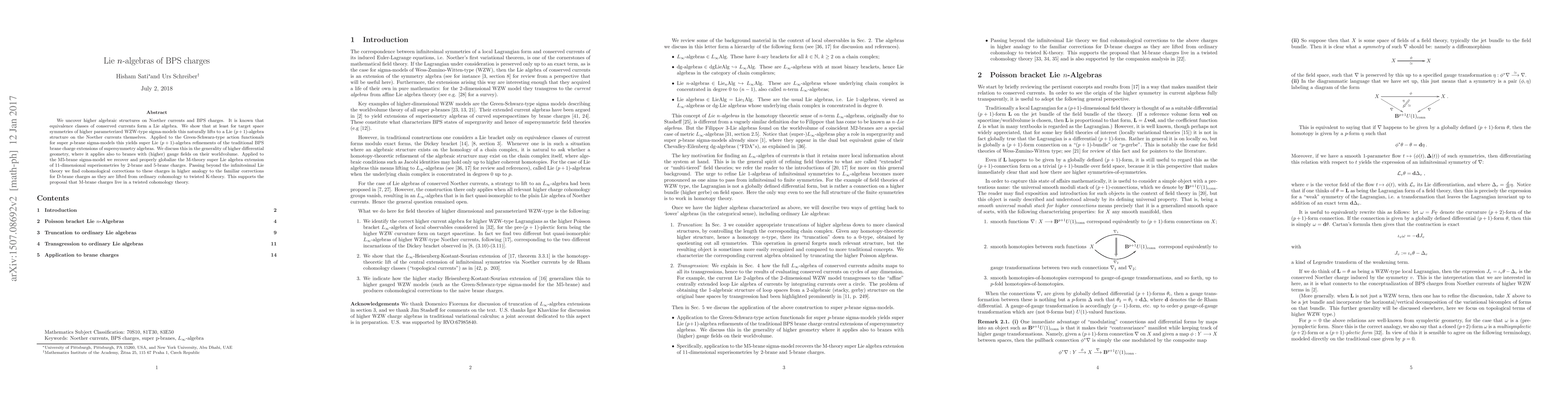 This paper explores higher algebraic structures on Noether currents and BPS charges, showing that they naturally form Lie (p+1)-algebras for certain sigma-models. It extends traditional BPS charge refinements and discusses implications in higher differential geometry, including the M5-brane sigma-model, with cohomological corrections akin to D-brane charges, suggesting M-brane charges reside in twisted cohomology.