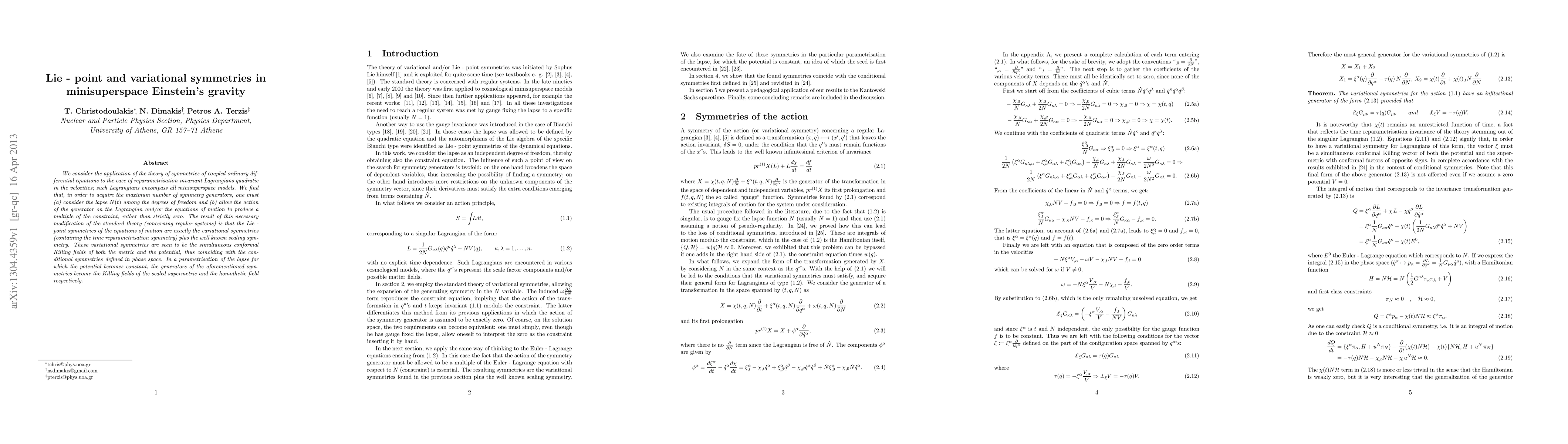 We consider the application of the theory of symmetries of coupled ordinary differential equations to the case of reparametrisation invariant Lagrangians quadratic in the velocities; such Lagrangians encompass all minisuperspace models. We find that, in order to acquire the maximum number of symmetry generators, one must (a) consider the lapse $N(t)$ among the degrees of freedom and (b) allow the action of the generator on the Lagrangian and/or the equations of motion to produce a multiple of the constraint, rather than strictly zero. The result of this necessary modification of the standard theory (concerning regular systems) is that the Lie - point symmetries of the equations of motion are exactly the variational symmetries (containing the time reparametrisation symmetry) plus the well known scaling symmetry. These variational symmetries are seen to be the simultaneous conformal Killing fields of both the metric and the potential, thus coinciding with the conditional symmetries defined in phase space. In a parametrisation of the lapse for which the potential becomes constant, the generators of the aforementioned symmetries become the Killing fields of the scaled supermetric and the homothetic field respectively.