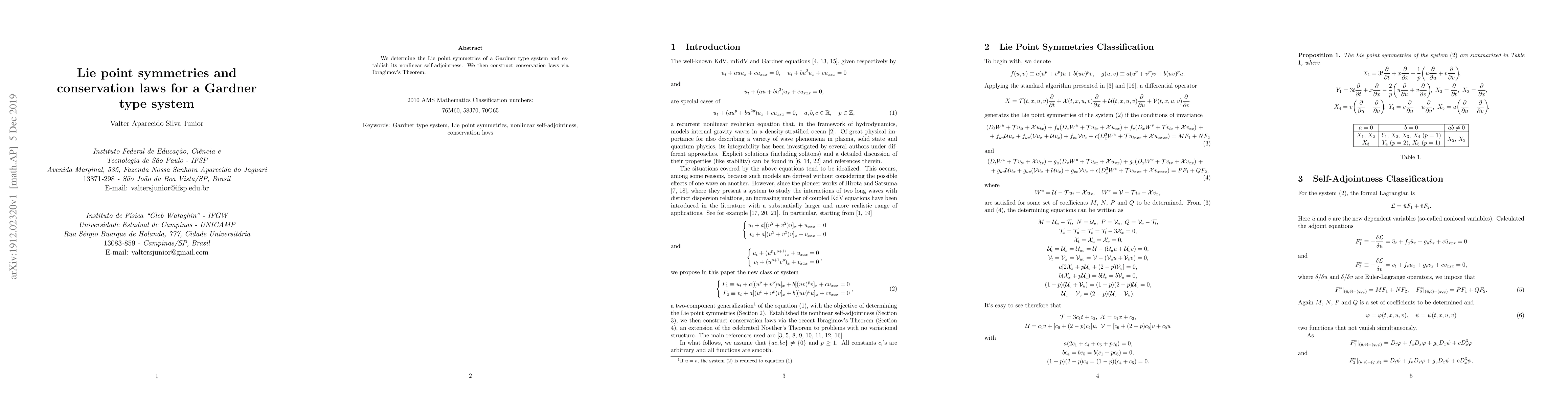 We determine the Lie point symmetries of a Gardner type system and establish its nonlinear self-adjointness. We then construct conservation laws via Ibragimov's Theorem.