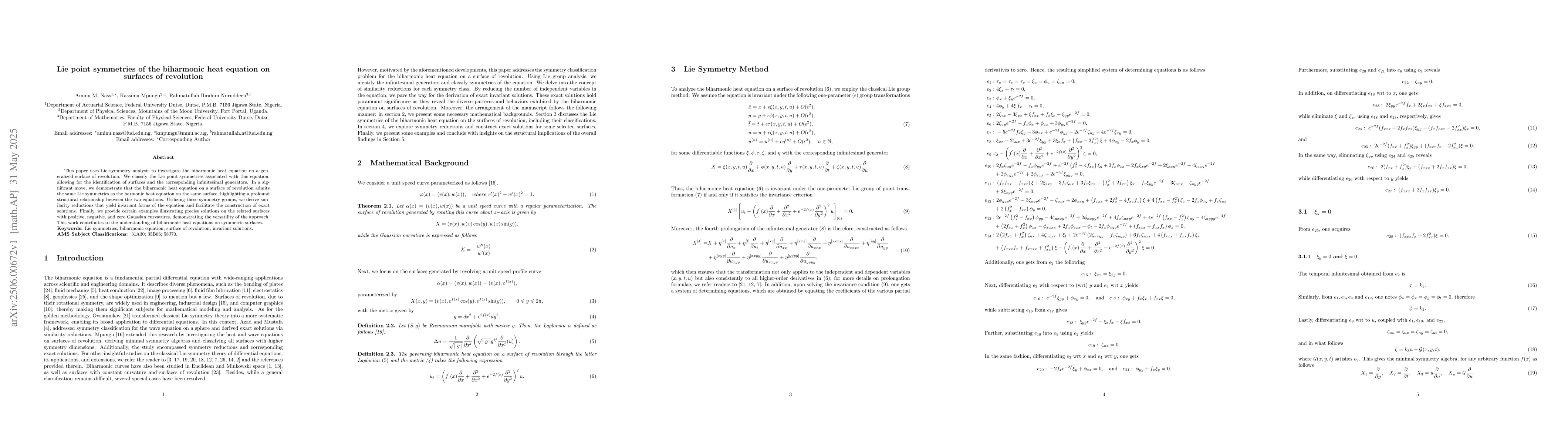 The identification and utilization of Lie point symmetries to derive similarity reductions and exact solutions for the biharmonic heat equation on surfaces of revolution.