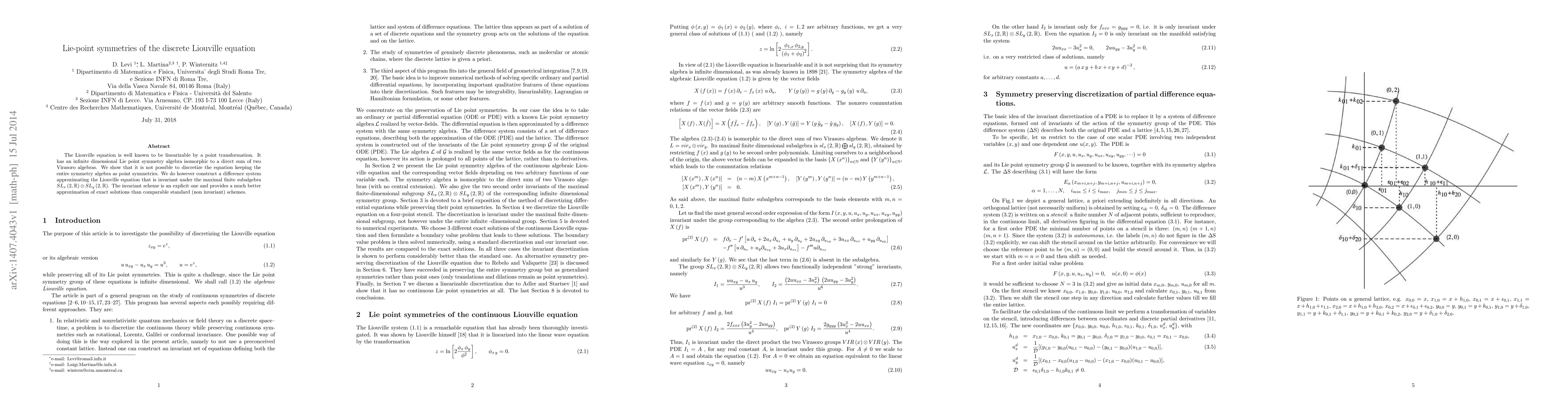 The Liouville equation is well known to be linearizable by a point transformation. It has an infinite dimensional Lie point symmetry algebra isomorphic to a direct sum of two Virasoro algebras. We show that it is not possible to discretize the equation keeping the entire symmetry algebra as point symmetries. We do however construct a difference system approximating the Liouville equation that is invariant under the maximal finite subalgebra $ SL_x \lf 2 , \mathbb{R} \rg \otimes SL_y \lf 2 , \mathbb{R} \rg $. The invariant scheme is an explicit one and provides a much better approximation of exact solutions than comparable standard (non invariant) schemes.