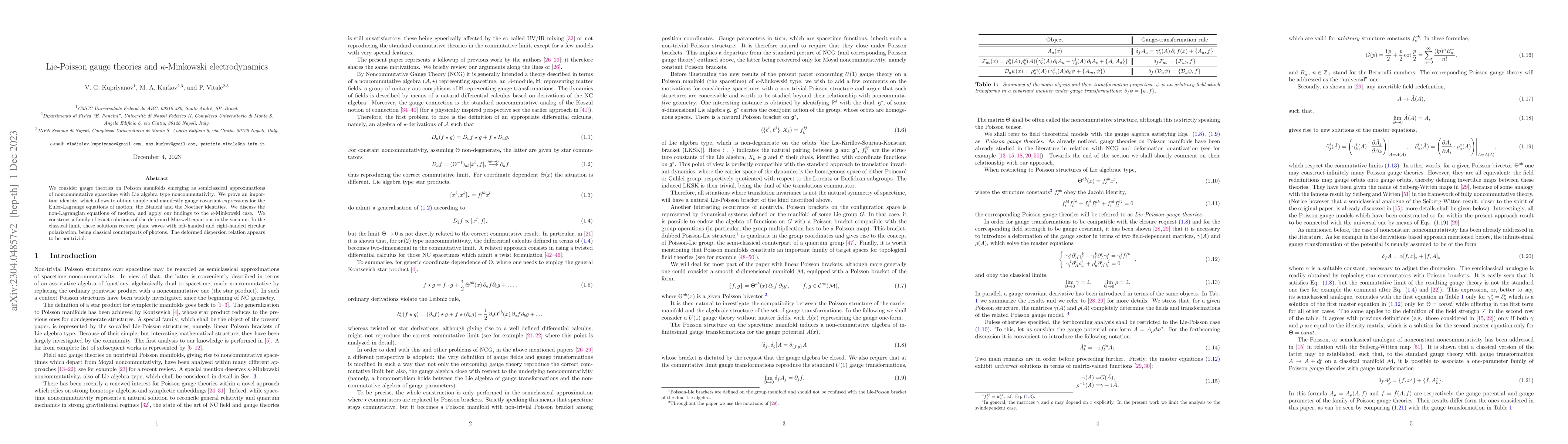 This paper explores gauge theories on Poisson manifolds as semiclassical approximations of noncommutative spacetime, proving an important identity for gauge-covariant expressions of motion equations. It constructs exact solutions for deformed Maxwell equations in $\kappa$-Minkowski electrodynamics, revealing nontrivial deformed dispersion relations and classical counterparts of photons.