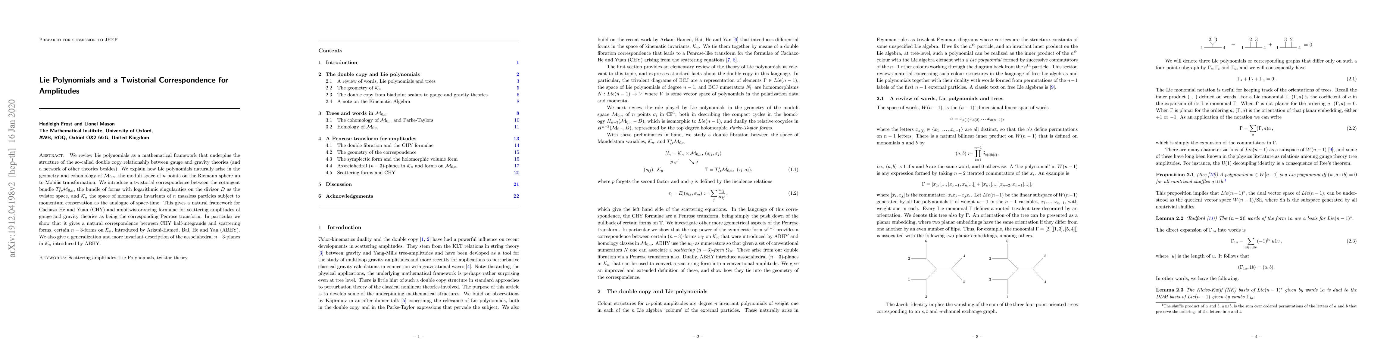 We review Lie polynomials as a mathematical framework that underpins the structure of the so-called double copy relationship between gauge and gravity theories (and a network of other theories besides). We explain how Lie polynomials naturally arise in the geometry and cohomology of $\mathcal{M}_{0,n}$, the moduli space of $n$ points on the Riemann sphere up to Mobi\"us transformation. We introduce a twistorial correspondence between the cotangent bundle $T^*_D\mathcal{M}_{0,n}$, the bundle of forms with logarithmic singularities on the divisor $D$ as the twistor space, and $\mathcal{K}_n$ the space of momentum invariants of $n$ massless particles subject to momentum conservation as the analogue of space-time. This gives a natural framework for Cachazo He and Yuan (CHY) and ambitwistor-string formulae for scattering amplitudes of gauge and gravity theories as being the corresponding Penrose transform. In particular we show that it gives a natural correspondence between CHY half-integrands and scattering forms, certain $n-3$-forms on $\mathcal{K}_n$, introduced by Arkani-Hamed, Bai, He and Yan (ABHY). We also give a generalization and more invariant description of the associahedral $n-3$-planes in $\mathcal{K}_n$ introduced by ABHY.}