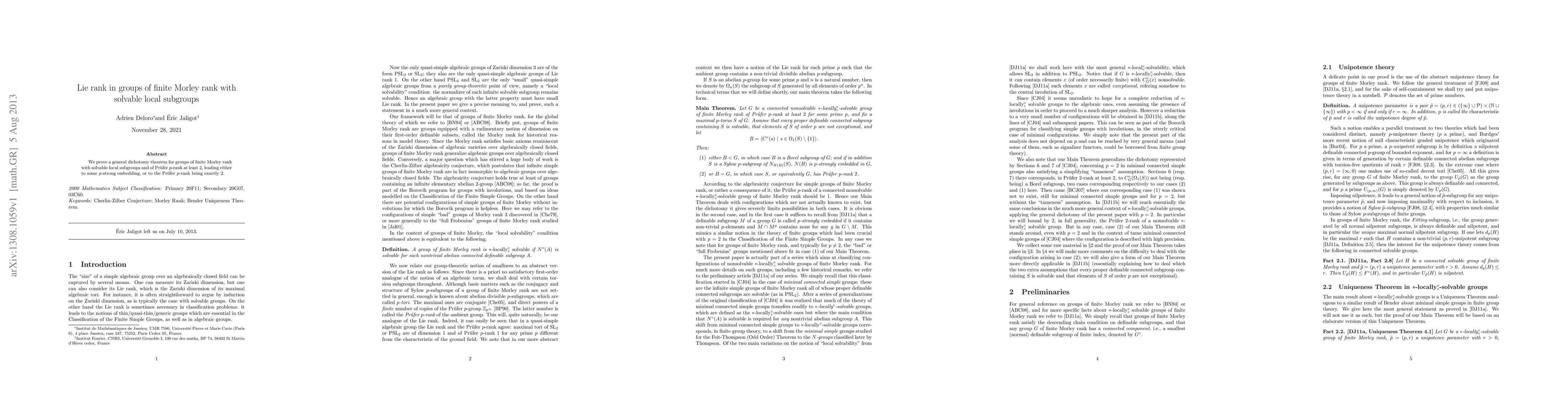 We prove a general dichotomy theorem for groups of finite Morley rank with solvable local subgroups and of Pr\"ufer p-rank at least 2, leading either to some p-strong embedding, or to the Pr\"ufer p-rank being exactly 2.