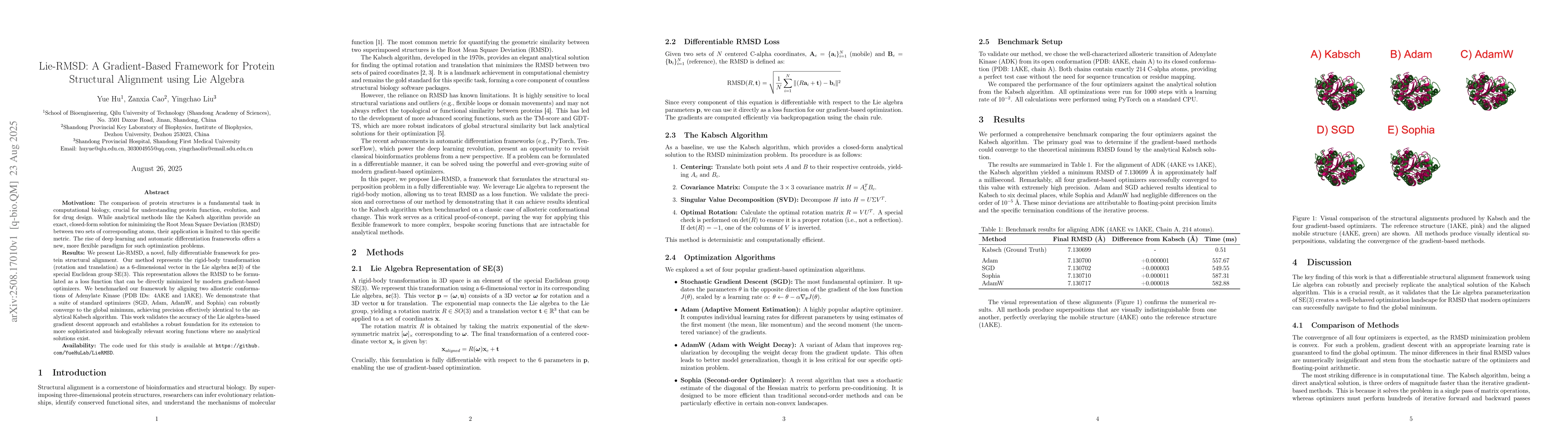 The comparison of protein structures is a fundamental task in computational biology, crucial for understanding protein function, evolution, and for drug design. While analytical methods like the Kabsch algorithm provide an exact, closed-form solution for minimizing the Root Mean Square Deviation (RMSD) between two sets of corresponding atoms, their application is limited to this specific metric. The rise of deep learning and automatic differentiation frameworks offers a new, more flexible paradigm for such optimization problems. We present Lie-RMSD, a novel, fully differentiable framework for protein structural alignment. Our method represents the rigid-body transformation (rotation and translation) as a 6-dimensional vector in the Lie algebra se(3) of the special Euclidean group SE(3). This representation allows the RMSD to be formulated as a loss function that can be directly minimized by modern gradient-based optimizers. We benchmarked our framework by aligning two allosteric conformations of Adenylate Kinase (PDB IDs: 4AKE and 1AKE). We demonstrate that a suite of standard optimizers (SGD, Adam, AdamW, and Sophia) can robustly converge to the global minimum, achieving precision effectively identical to the analytical Kabsch algorithm. This work validates the accuracy of the Lie algebra-based gradient descent approach and establishes a robust foundation for its extension to more sophisticated and biologically relevant scoring functions where no analytical solutions exist.