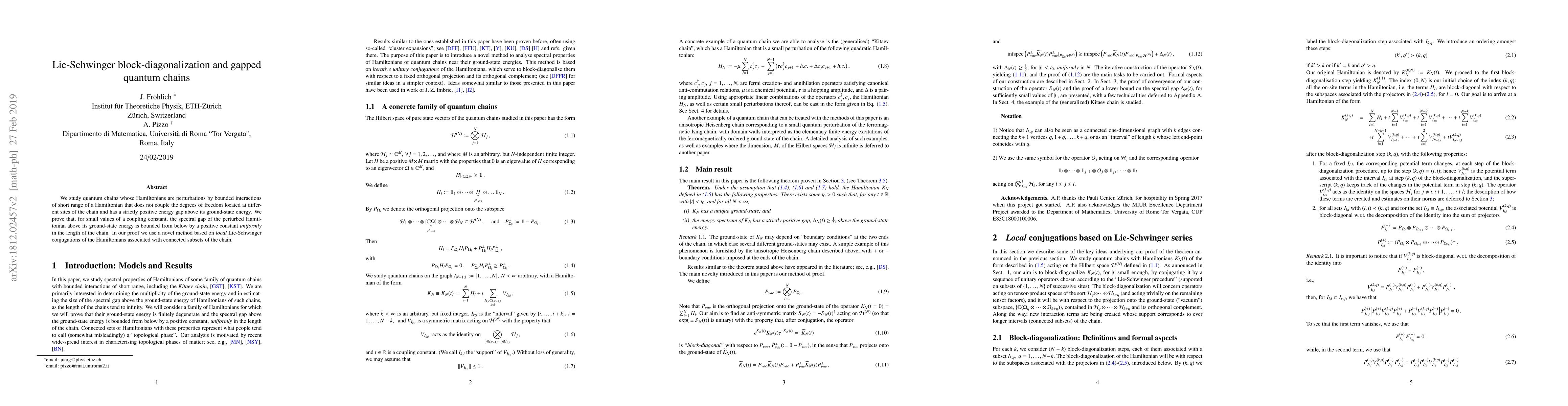 We study quantum chains whose Hamiltonians are perturbations by bounded interactions of short range of a Hamiltonian that does not couple the degrees of freedom located at different sites of the chain and has a strictly positive energy gap above its ground-state energy. We prove that, for small values of a coupling constant, the spectral gap of the perturbed Hamiltonian above its ground-state energy is bounded from below by a positive constant uniformly in the length of the chain. In our proof we use a novel method based on local Lie-Schwinger conjugations of the Hamiltonians associated with connected subsets of the chain.