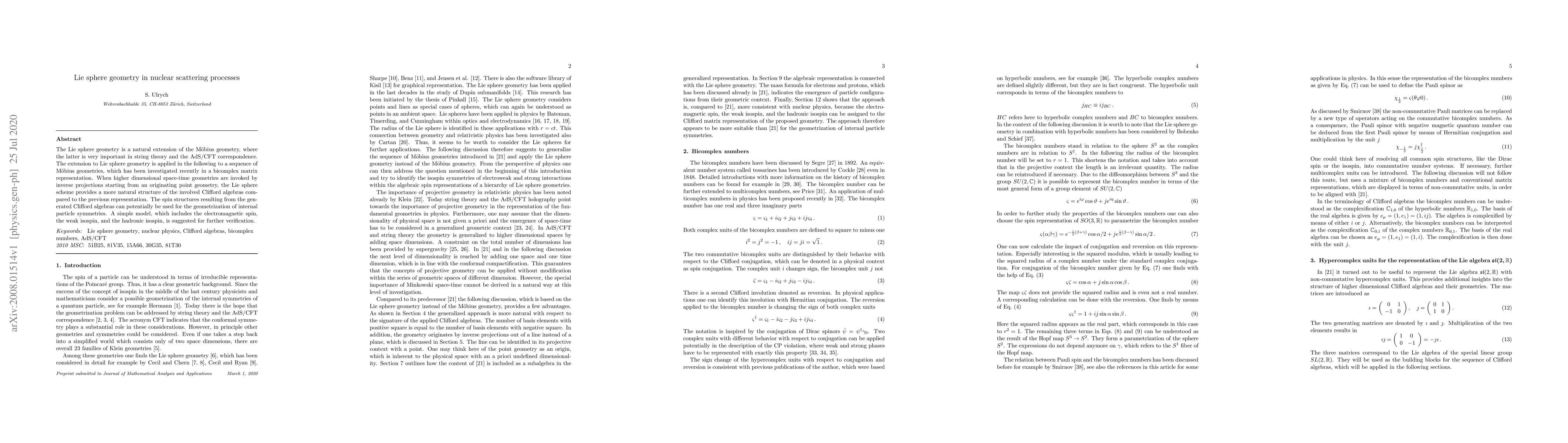 This paper explores the application of Lie sphere geometry to nuclear scattering processes, extending M\"obius geometry to better represent higher-dimensional space-time geometries. The Lie sphere scheme offers a more natural structure for Clifford algebras and spin structures, potentially aiding in the geometrization of internal particle symmetries, with a proposed simple model for electromagnetic, weak, and hadronic isospins.