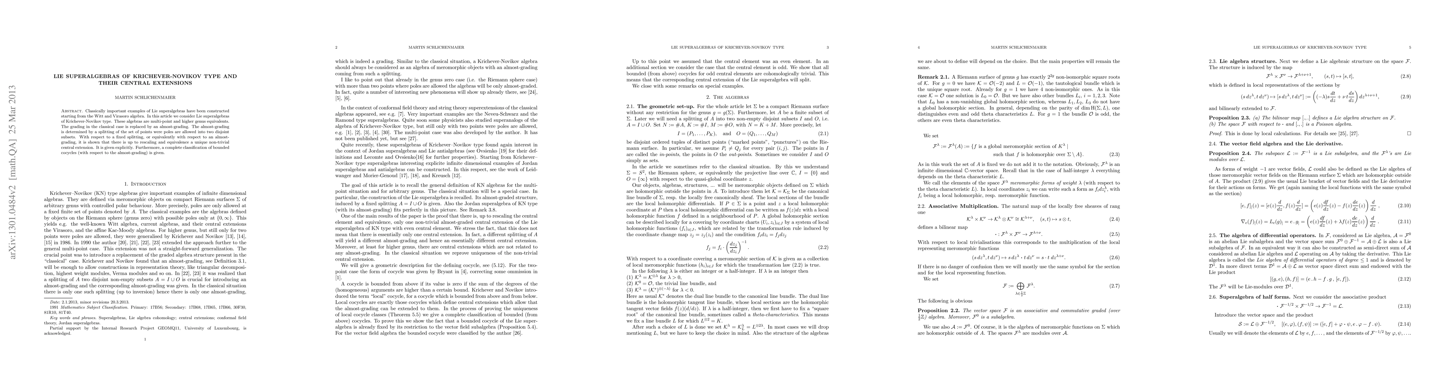Classically important examples of Lie superalgebras have been constructed starting from the Witt and Virasoro algebra. In this article we consider Lie superalgebras of Krichever-Novikov type. These algebras are multi-point and higher genus equivalents. The grading in the classical case is replaced by an almost-grading. The almost-grading is determined by a splitting of the set of points were poles are allowed into two disjoint subsets. With respect to a fixed splitting, or equivalently with respect to an almost-grading, it is shown that there is up to rescaling and equivalence a unique non-trivial central extension. It is given explicitly. Furthermore, a complete classification of bounded cocycles (with respect to the almost-grading) is given.