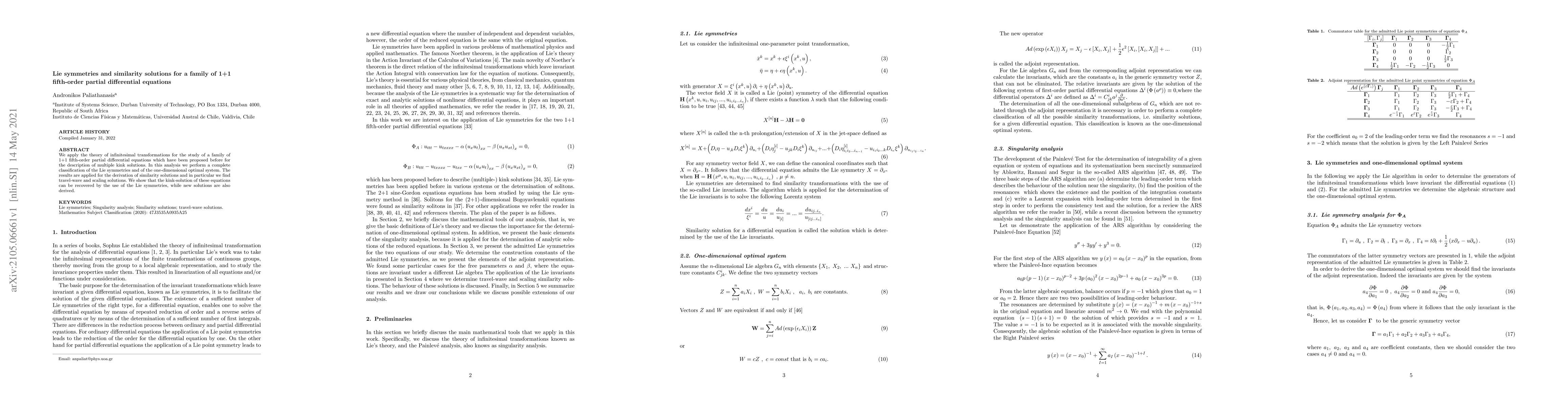 This paper classifies Lie symmetries and similarity solutions for a family of 1+1 fifth-order partial differential equations, recovering the kink solution and deriving new ones through infinitesimal transformations.