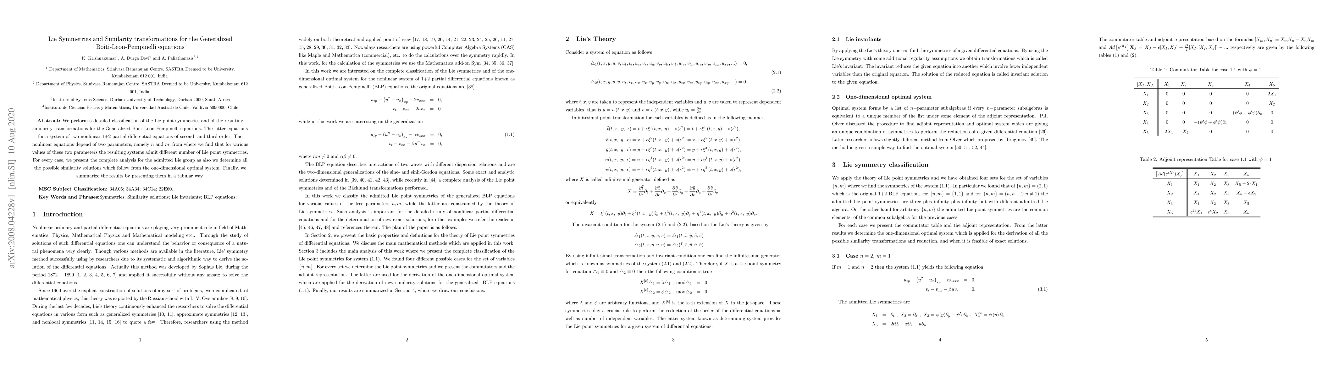 We perform a detailed classification of the Lie point symmetries and of the resulting similarity transformations for the Generalized Boiti-Leon-Pempinelli equations. The latter equations for a system of two nonlinear 1+2 partial differential equations of second- and third-order. The nonlinear equations depend of two parameters, namely $n$ and $m$, from where we find that for various values of these two parameters the resulting systems admit different number of Lie point symmetries. For every case, we present the complete analysis for the admitted Lie group as also we determine all the possible similarity solutions which follow from the one-dimensional optimal system. Finally, we summarize the results by presenting them in a tabular way.