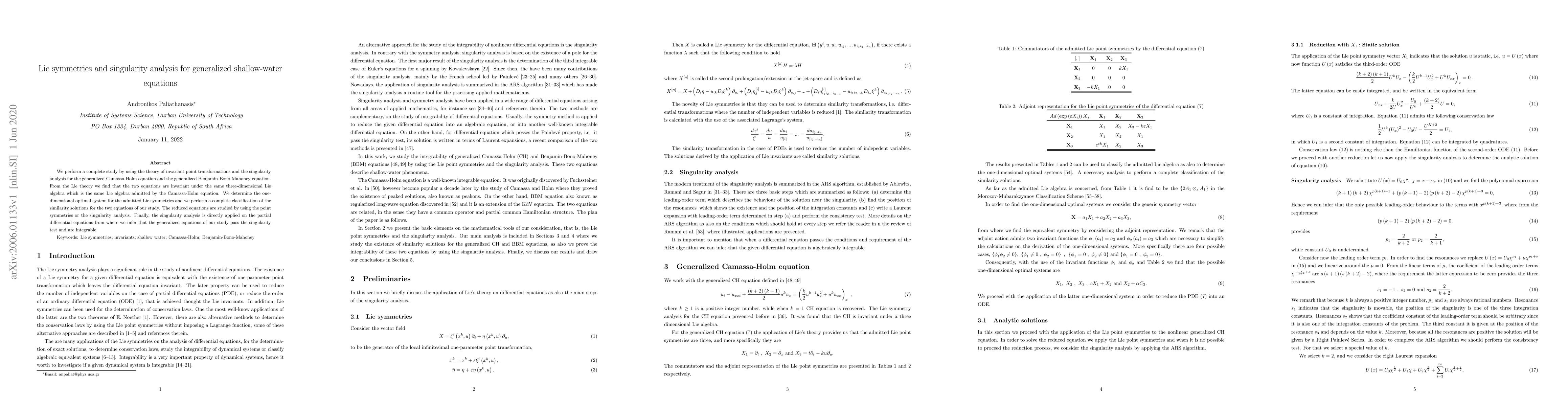 This paper investigates the Lie symmetries and singularity analysis of the generalized Camassa-Holm and Benjamin-Bono-Mahoney equations, revealing that they share the same three-dimensional Lie algebra. The study classifies similarity solutions and confirms the integrability of the generalized equations through singularity analysis.