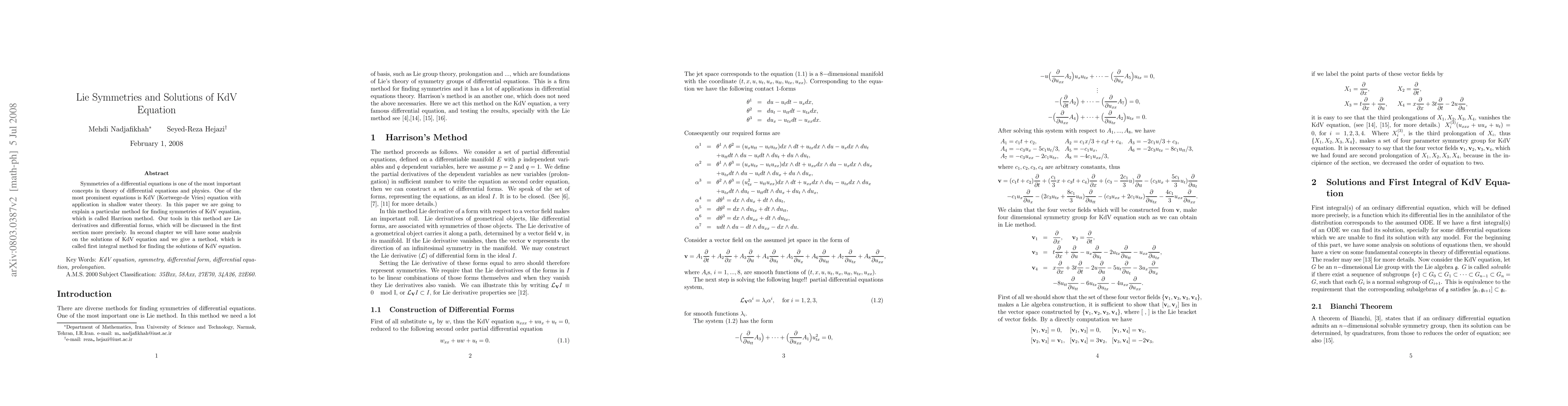Symmetries of a differential equations is one of the most important concepts in theory of differential equations and physics. One of the most prominent equations is KdV (Kortwege-de Vries) equation with application in shallow water theory. In this paper we are going to explain a particular method for finding symmetries of KdV equation, which is called Harrison method. Our tools in this method are Lie derivatives and differential forms, which will be discussed in the first section more precisely. In second chapter we will have some analysis on the solutions of KdV equation and we give a method, which is called first integral method for finding the solutions of KdV equation.