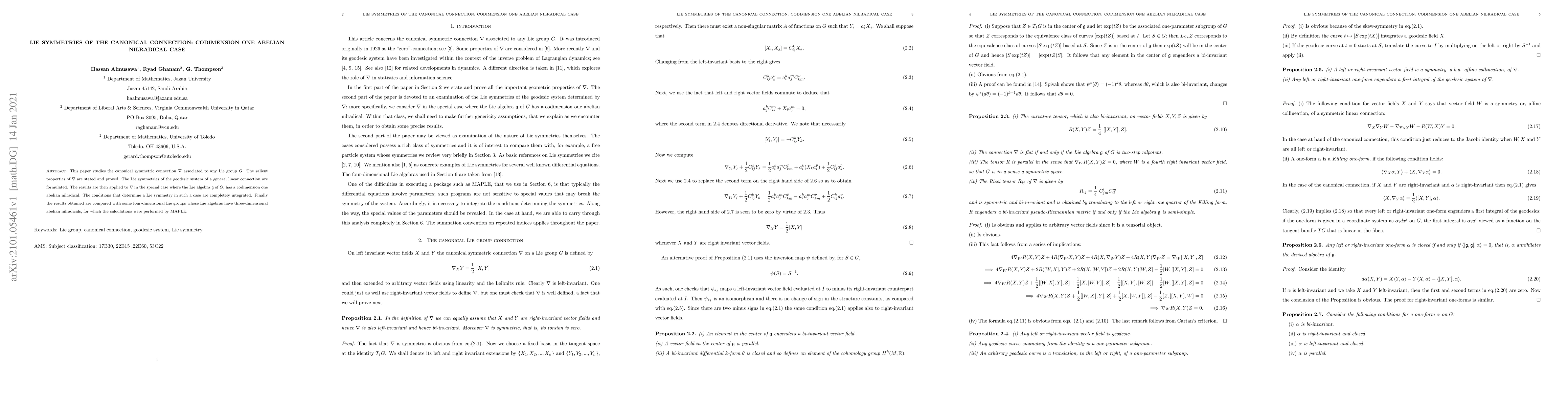 This paper studies the canonical symmetric connection $\nabla$ associated to any Lie group $G$. The salient properties of $\nabla$ are stated and proved. The Lie symmetries of the geodesic system of a general linear connection are formulated. The results are then applied to $\nabla$ in the special case where the Lie algebra $\g$ of $G$, has a codimension one abelian nilradical. The conditions that determine a Lie symmetry in such a case are completely integrated. Finally the results obtained are compared with some four-dimensional Lie groups whose Lie algebras have three-dimensional abelian nilradicals, for which the calculations were performed by MAPLE.