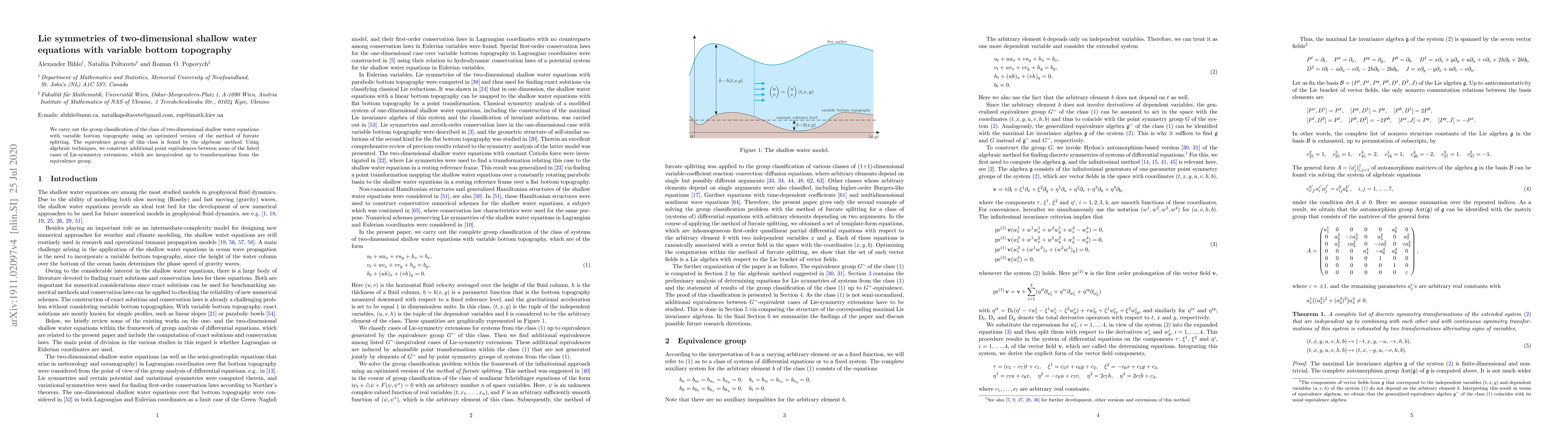 This paper classifies the symmetries of two-dimensional shallow water equations with variable bottom topography using an optimized method of furcate splitting. It identifies the equivalence group via algebraic techniques and constructs additional point equivalences for inequivalent Lie-symmetry extensions.