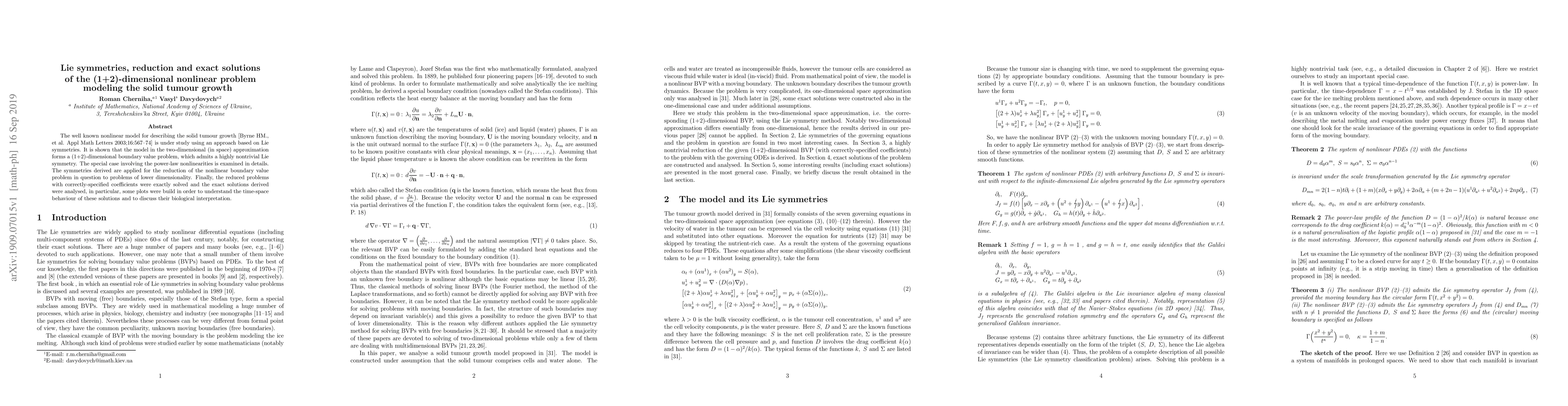 The well known nonlinear model for describing the solid tumour growth [Byrne HM., et al. Appl Math Letters 2003;16:567-74] is under study using an approach based on Lie symmetries. It is shown that the model in the two-dimensional (in space) approximation forms a (1+2)-dimensional boundary value problem, which admits a highly nontrivial Lie symmetry. The special case involving the power-law nonlinearities is examined in details. The symmetries derived are applied for the reduction of the nonlinear boundary value problem in question to problems of lower dimensionality. Finally, the reduced problems with correctly-specified coefficients were exactly solved and the exact solutions derived were analysed, in particular, some plots were build in order to understand the time-space behaviour of these solutions and to discuss their biological interpretation.