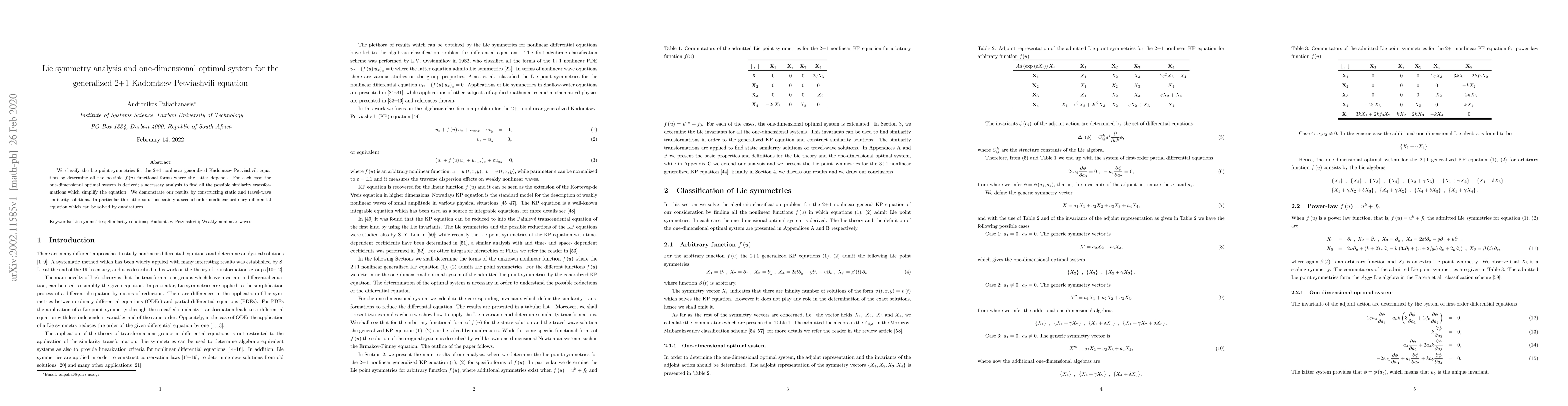 This paper classifies Lie point symmetries for the generalized 2+1 Kadomtsev-Petviashvili equation, determining f(u) functional forms and deriving one-dimensional optimal systems. It constructs static and travel-wave similarity solutions, demonstrating that the latter satisfy a solvable second-order nonlinear ordinary differential equation.
