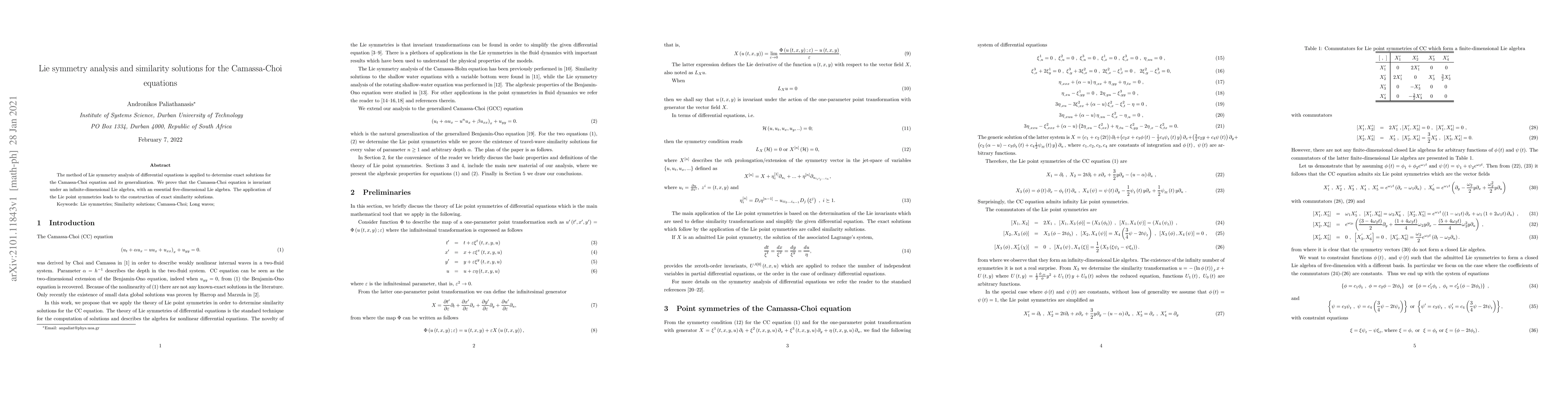 This paper applies Lie symmetry analysis to find exact solutions for the Camassa-Choi equation and its generalization, demonstrating invariance under an infinite-dimensional Lie algebra and constructing exact similarity solutions using Lie point symmetries.