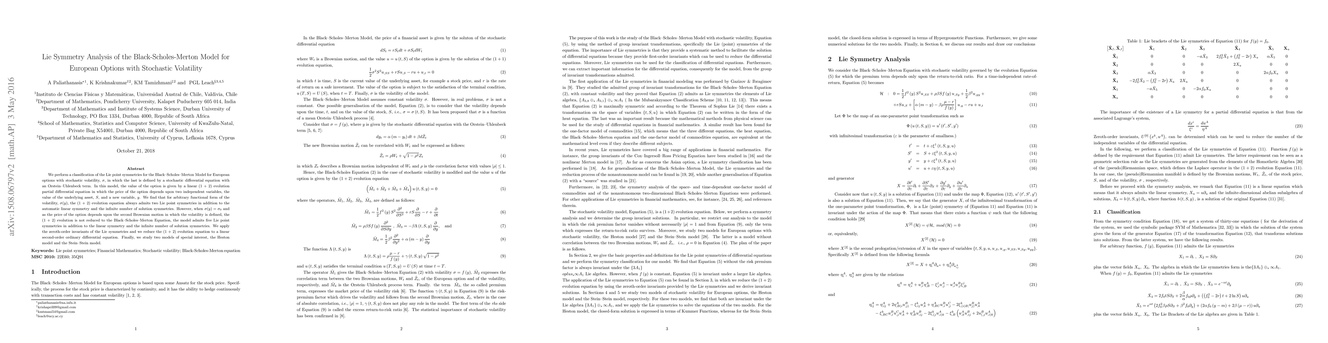 This paper classifies Lie point symmetries for the Black-Scholes-Merton model with stochastic volatility, revealing two universal symmetries regardless of the volatility function. When volatility is constant, five additional symmetries emerge, leading to a reduction of the evolution equation to a linear second-order ODE. Special models like Heston and Stein-Stein are also analyzed.