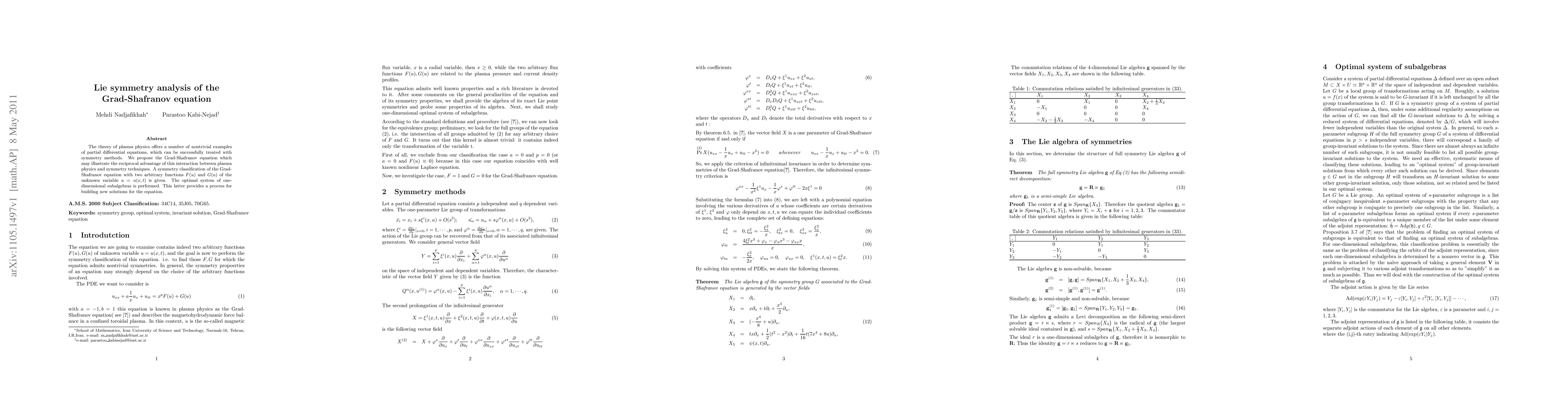 This paper explores the Grad-Shafranov equation in plasma physics using symmetry analysis to classify its symmetries and construct new solutions through an optimal system of one-dimensional subalgebras. The study highlights the mutual benefits of integrating symmetry techniques with plasma physics.
