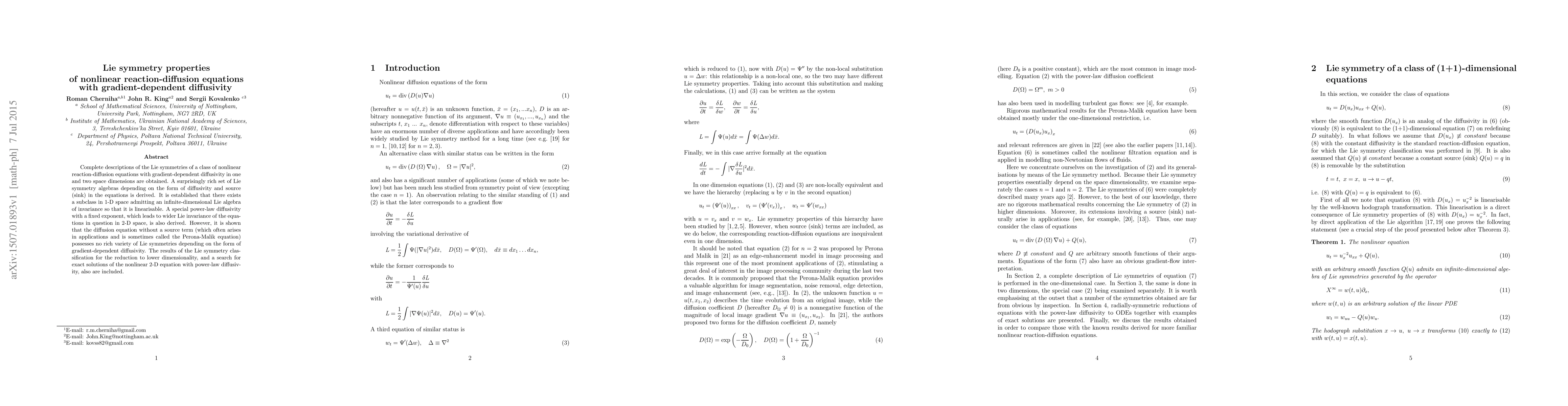 This paper investigates the Lie symmetry properties of nonlinear reaction-diffusion equations with gradient-dependent diffusivity, revealing a rich set of symmetry algebras. It finds that a subclass in 1-D space has an infinite-dimensional Lie algebra, allowing linearization, while a specific power-law diffusivity enhances symmetry in 2-D space.