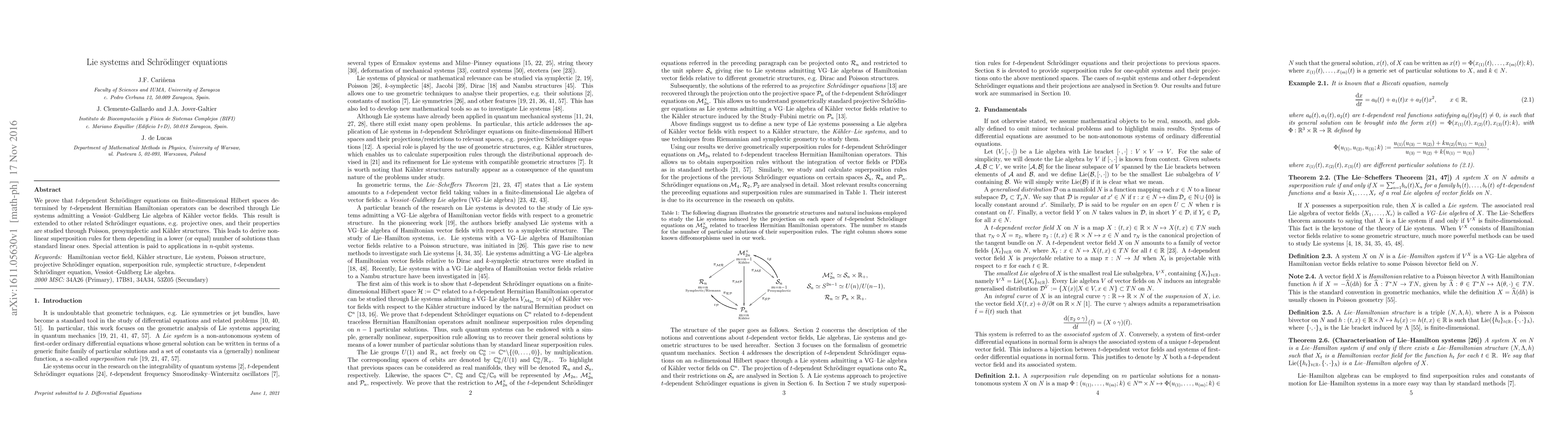 The paper demonstrates that $t$-dependent Schrödinger equations in finite-dimensional Hilbert spaces can be characterized by Lie systems with a Vessiot-Guldberg Lie algebra of Kähler vector fields. The findings are extended to projective Schrödinger equations, revealing nonlinear superposition rules with fewer solutions compared to linear methods, and have applications in $n$-qubit systems.