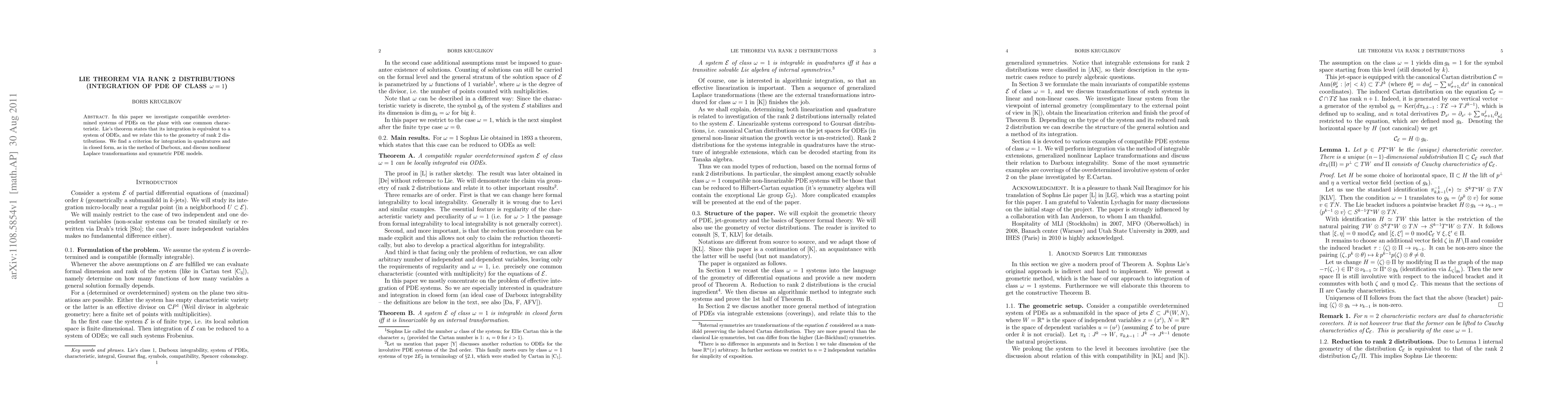 In this paper we investigate compatible overdetermined systems of PDEs on the plane with one common characteristic. Lie's theorem states that its integration is equivalent to a system of ODEs, and we relate this to the geometry of rank 2 distributions. We find a criterion for integration in quadratures and in closed form, as in the method of Darboux, and discuss nonlinear Laplace transformations and symmetric PDE models.