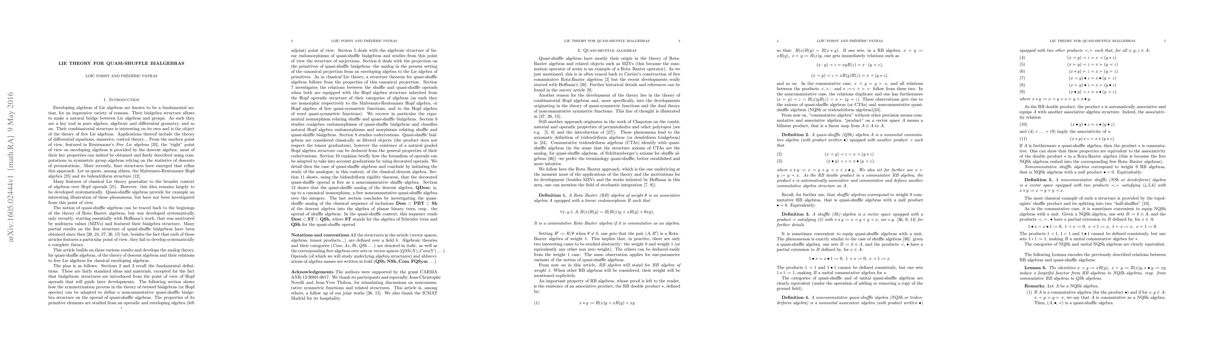 Many features of classical Lie theory generalize to the broader context of algebras over Hopf operads. However, this idea remains largely to be developed systematically. Quasi-shuffle algebras provide for example an interesting illustration of these phenomena, but have not been investigated from this point of view.The notion of quasi-shuffle algebras can be traced back to the beginings of the theory of Rota--Baxter algebras, but was developed systematically only recently, starting essentially with Hoffman's work, that was motivated by multizeta values (MZVs) and featured their bialgebra structure. Many partial results on the fine structure of quasi-shuffle bialgebras have been obtained since then but, besides the fact that each of these articles features a particular point of view, they fail to develop systematically a complete theory.This article builds on these various results and develops the analog theory, for quasi-shuffle algebras, of the theory of descent algebras and their relations to free Lie algebras for classical enveloping algebras.