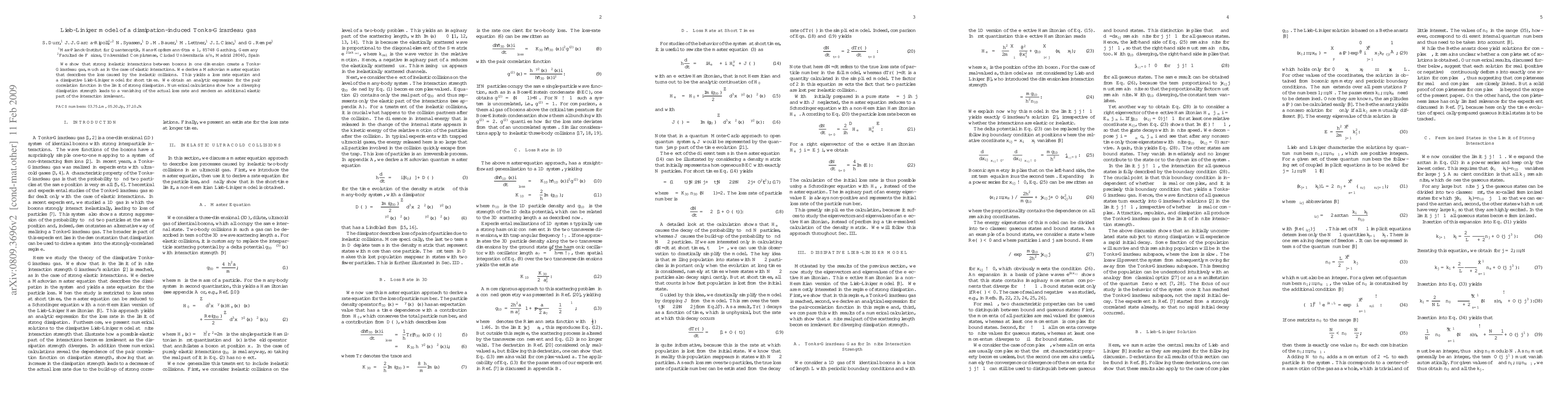 This paper investigates the Lieb-Liniger model with strong inelastic interactions among one-dimensional bosons, showing it can create a Tonks-Girardeau gas similarly to elastic interactions. It derives a Markovian master equation to describe inelastic collision losses and finds an analytic expression for the pair correlation function under strong dissipation.