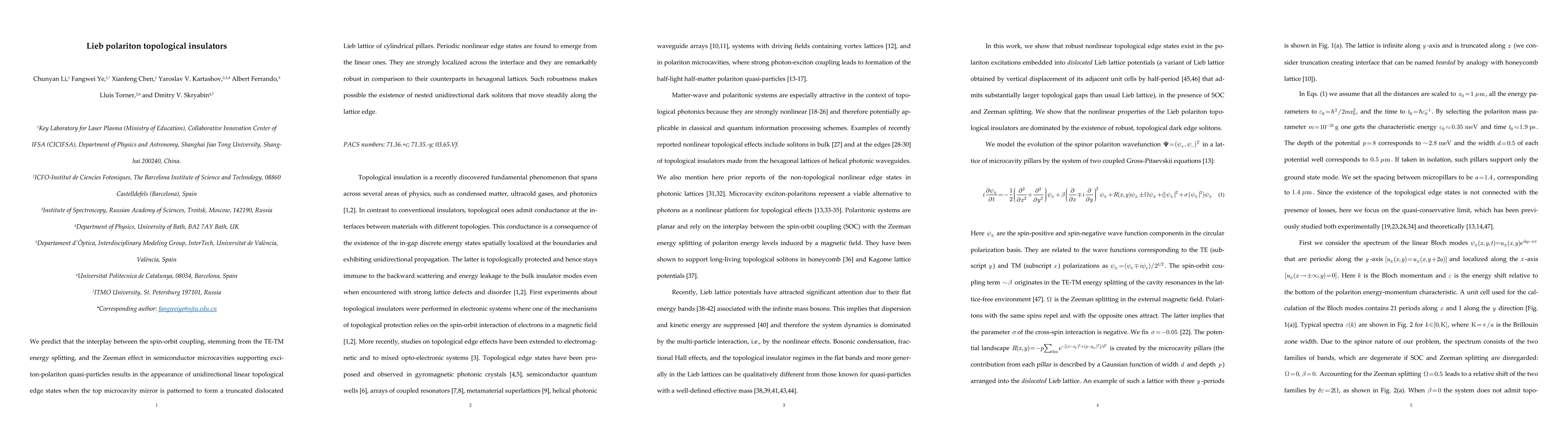 We predict that the interplay between the spin-orbit coupling, stemming from the TE-TM energy splitting, and the Zeeman effect in semiconductor microcavities supporting exci- ton-polariton quasi-particles results in the appearance of unidirectional linear topological edge states when the top microcavity mirror is patterned to form a truncated dislocated Lieb lattice of cylindrical pillars. Periodic nonlinear edge states are found to emerge from the linear ones. They are strongly localized across the interface and they are remarkably robust in comparison to their counterparts in hexagonal lattices. Such robustness makes possible the existence of nested unidirectional dark solitons that move steadily along the lattice edge.