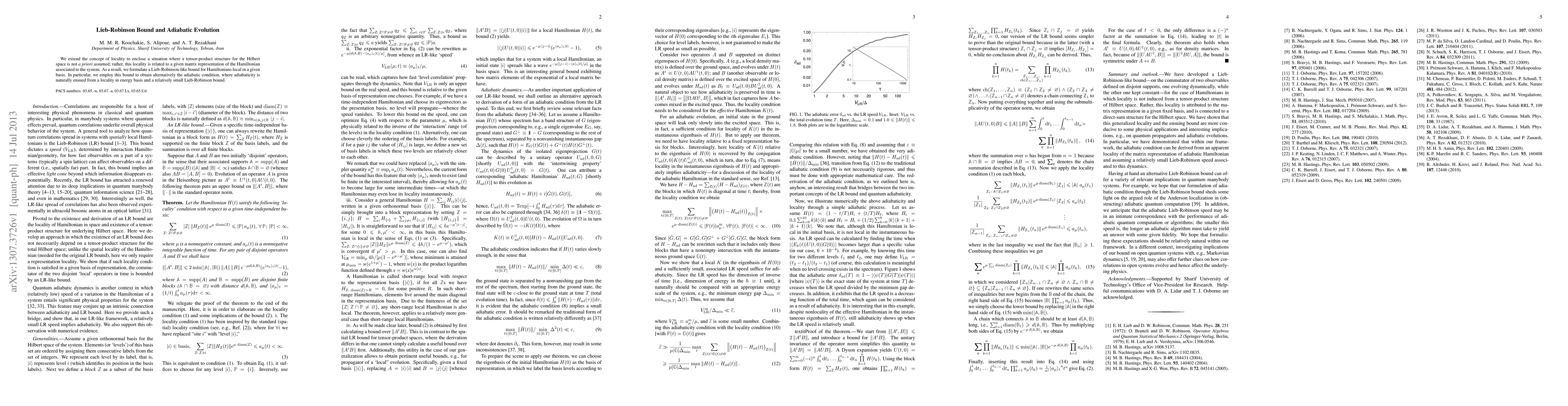 This paper formulates a Lieb-Robinson-like bound for Hamiltonians that are local in a given basis, without assuming a tensor-product structure for the Hilbert space. It uses this bound to derive the adiabatic condition, showing that adiabaticity follows from locality in the energy basis and a small Lieb-Robinson bound.
