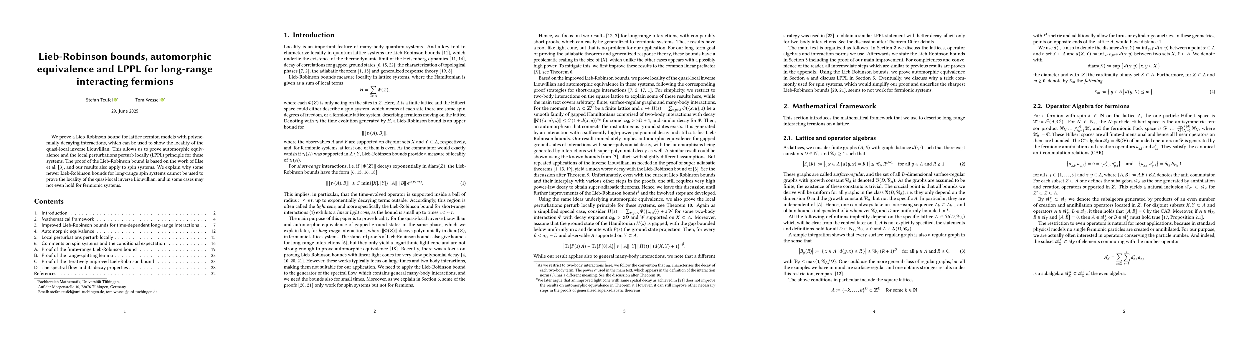 We prove a Lieb-Robinson bound for lattice fermion models with polynomially decaying interactions, which can be used to show the locality of the quasi-local inverse Liouvillian. This allows us to prove automorphic equivalence and the local perturbations perturb locally (LPPL) principle for these systems. The proof of the Lieb-Robinson bound is based on the work of Else et al. (2020), and our results also apply to spin systems. We explain why some newer Lieb-Robinson bounds for long-range spin systems cannot be used to prove the locality of the quasi-local inverse Liouvillian, and in some cases may not even hold for fermionic systems.