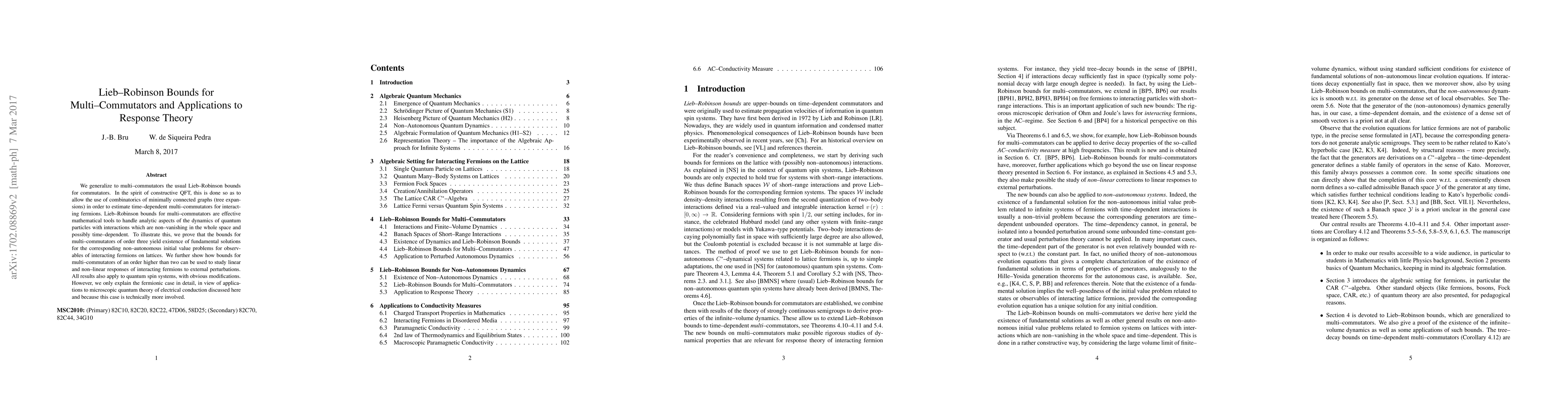 We generalize to multi-commutators the usual Lieb-Robinson bounds for commutators. In the spirit of constructive QFT, this is done so as to allow the use of combinatorics of minimally connected graphs (tree expansions) in order to estimate time-dependent multi-commutators for interacting fermions. Lieb-Robinson bounds for multi-commutators are effective mathematical tools to handle analytic aspects of the dynamics of quantum particles with interactions which are non-vanishing in the whole space and possibly time-dependent. To illustrate this, we prove that the bounds for multi-commutators of order three yield existence of fundamental solutions for the corresponding non-autonomous initial value problems for observables of interacting fermions on lattices. We further show how bounds for multi-commutators of an order higher than two can be used to study linear and non-linear responses of interacting fermions to external perturbations. All results also apply to quantum spin systems, with obvious modifications. However, we only explain the fermionic case in detail, in view of applications to microscopic quantum theory of electrical conduction discussed here and because this case is technically more involved.