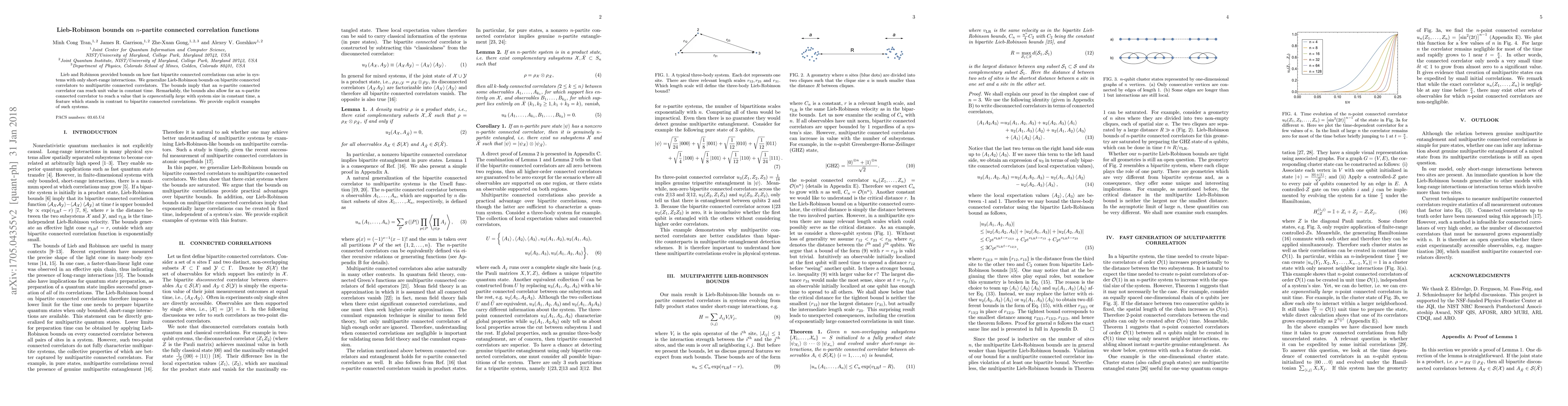 This paper generalizes Lieb-Robinson bounds to $n$-partite connected correlation functions, showing that these correlators can reach unit values in constant time. It also highlights that $n$-partite correlators can achieve exponentially large values in constant time, contrasting with bipartite correlations.
