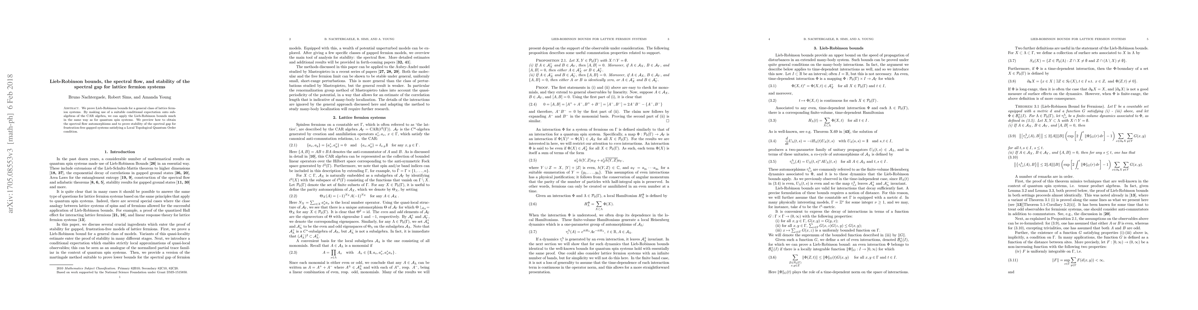 This paper establishes Lieb-Robinson bounds for lattice fermion systems, employing conditional expectations onto subalgebras akin to quantum spin systems. It also explores spectral flow automorphisms and proves the stability of the spectral gap for frustration-free gapped systems with a Local Topological Quantum Order condition.