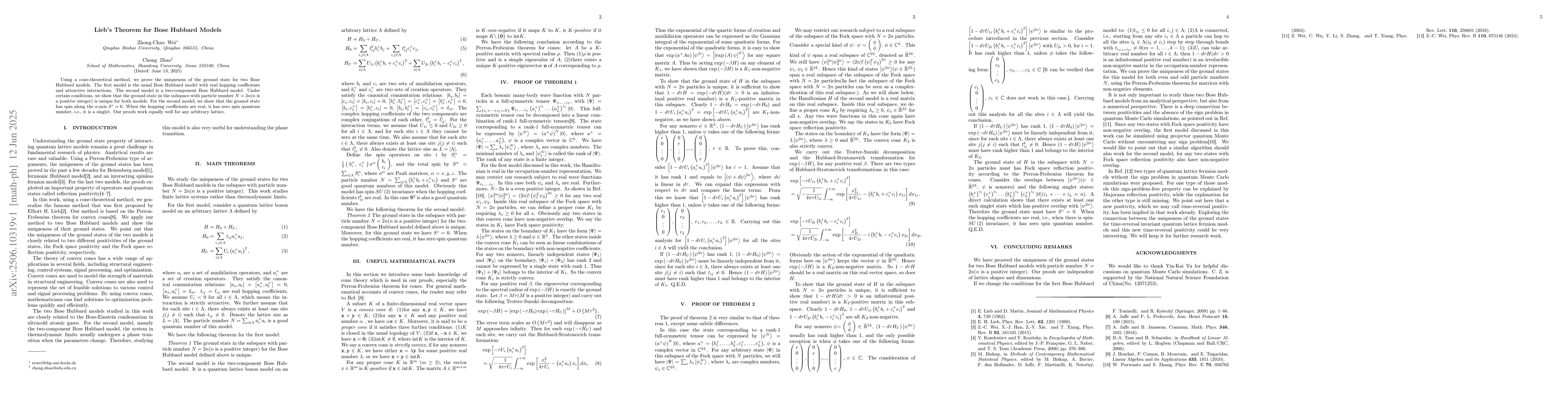 Researchers prove the uniqueness of ground states for two Bose Hubbard models using a cone-theoretical method, showing both models have unique ground states under certain conditions.