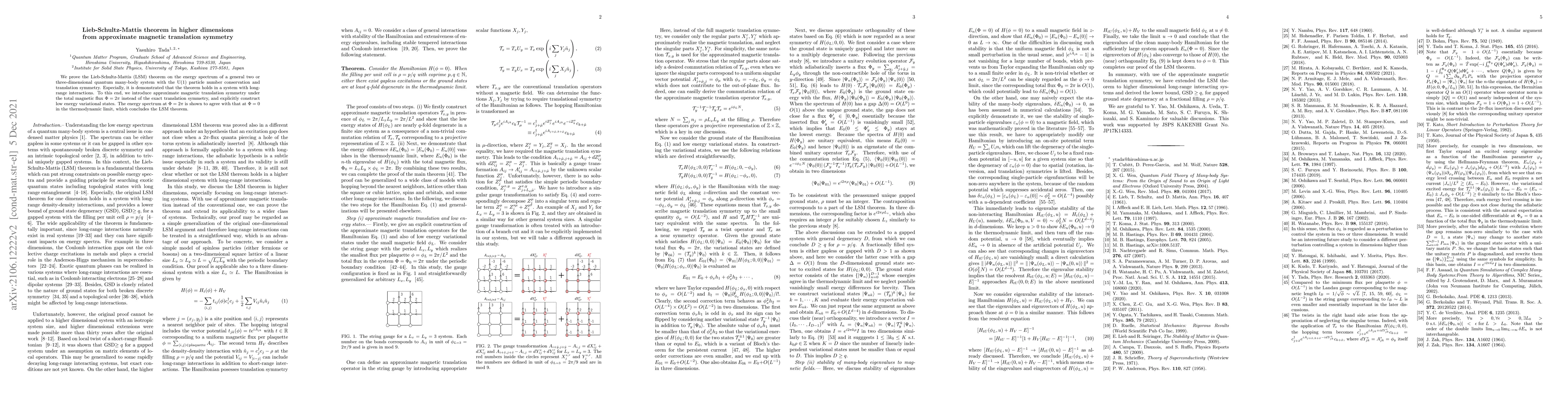 This paper proves the Lieb-Schultz-Mattis theorem for two or three-dimensional quantum systems with U(1) particle number conservation and translation symmetry, even with long-range interactions. It introduces approximate magnetic translation symmetry and constructs low energy states, showing the energy spectrum equivalence at different magnetic fluxes, thus validating the theorem.