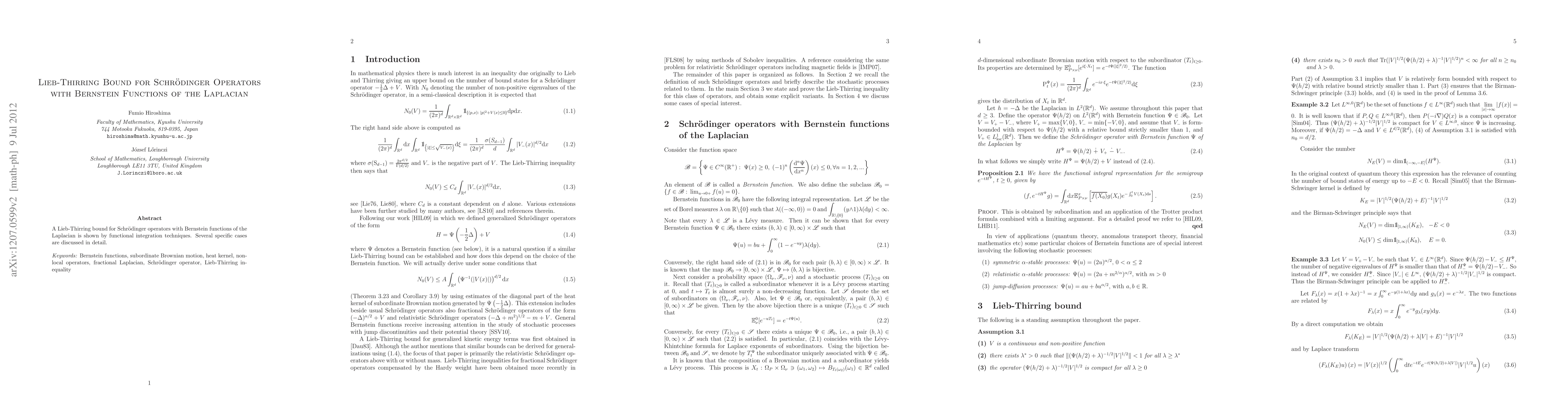 Summary: This paper establishes a Lieb-Thirring bound for Schrödinger operators incorporating Bernstein functions of the Laplacian using functional integration methods, with detailed discussions on specific cases.