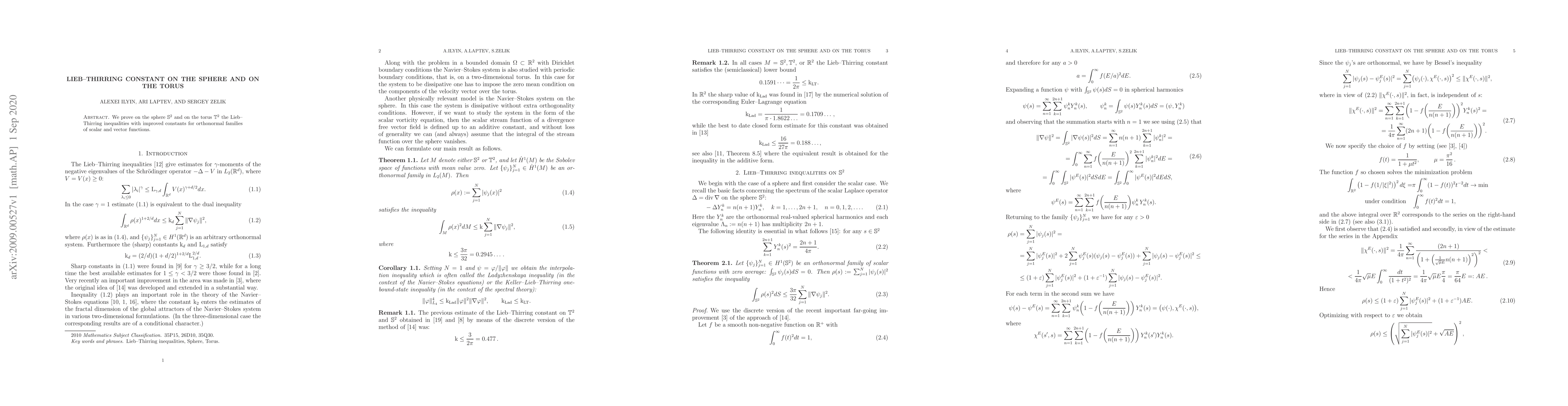 Summary: This paper establishes improved Lieb-Thirring inequalities for orthonormal families of scalar and vector functions on both the 2D sphere and the 2D torus, providing enhanced constants for these inequalities.