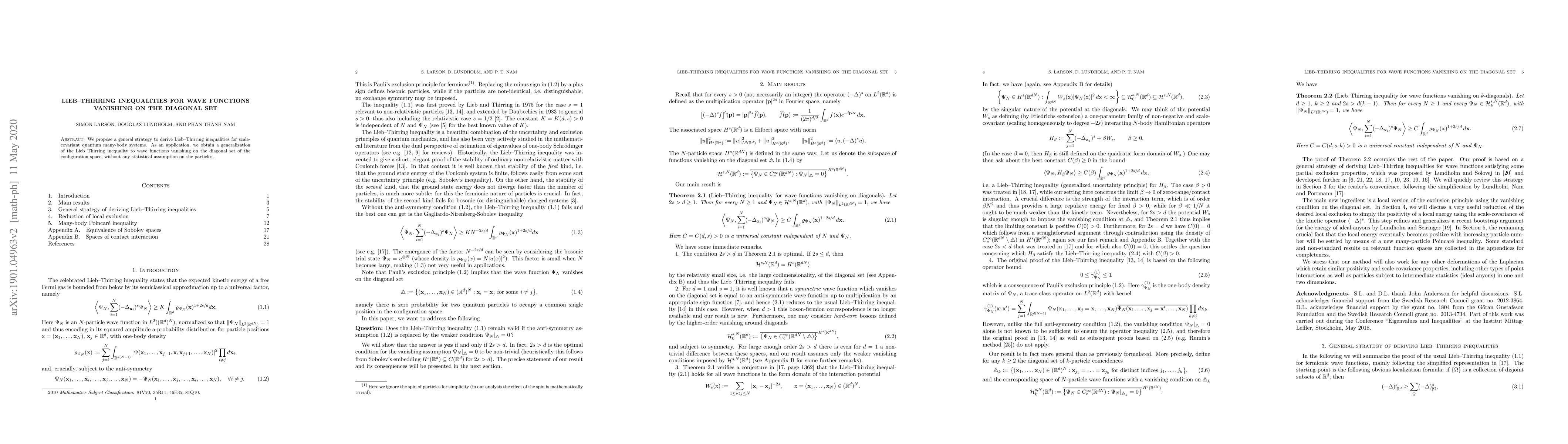 We propose a general strategy to derive Lieb-Thirring inequalities for scale-covariant quantum many-body systems. As an application, we obtain a generalization of the Lieb-Thirring inequality to wave functions vanishing on the diagonal set of the configuration space, without any statistical assumption on the particles.