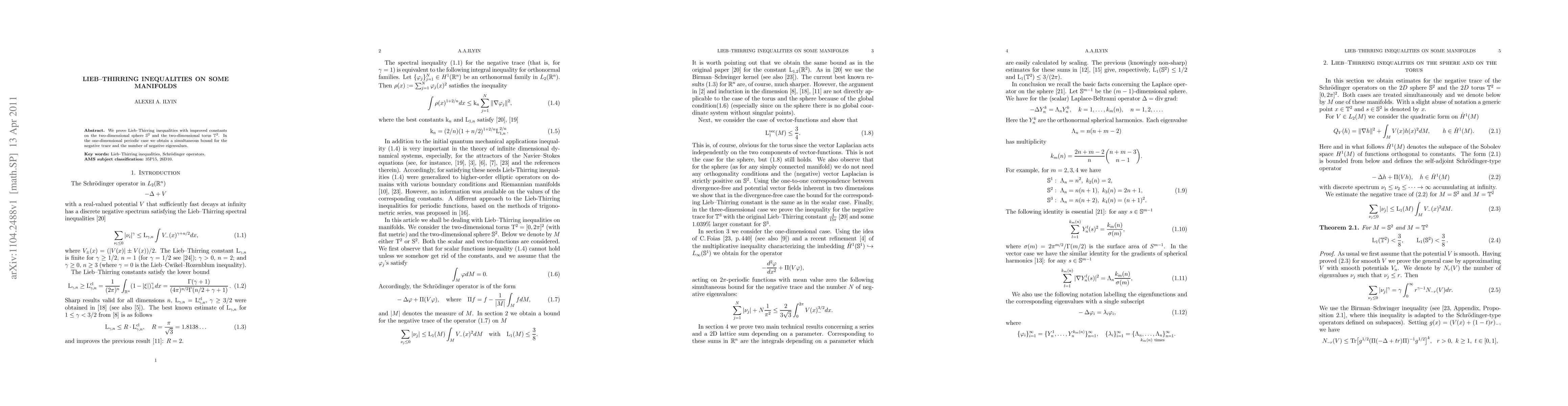 Summary: This paper establishes Lieb-Thirring inequalities with enhanced constants on the 2D sphere and 2D torus, and provides a unified bound for the negative trace and the number of negative eigenvalues in the 1D periodic scenario.