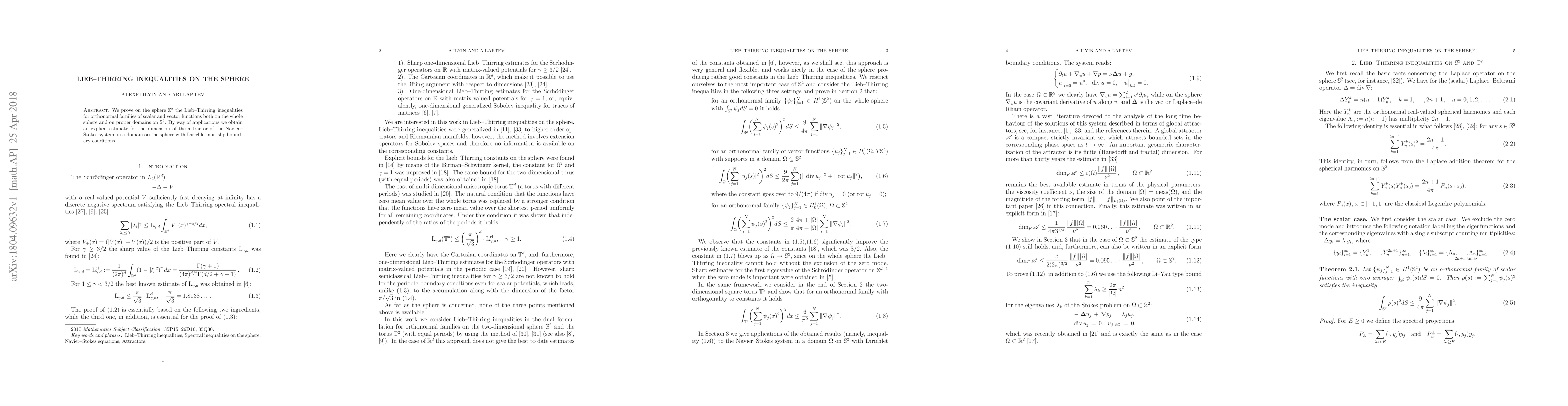 We prove on the sphere $\mathbb{S}^2$ the Lieb--Thirring inequalities for orthonormal families of scalar and vector functions both on the whole sphere and on proper domains on $\mathbb{S}^2$. By way of applications we obtain an explicit estimate for the dimension of the attractor of the Navier--Stokes system on a domain on the sphere with Dirichlet non-slip boundary conditions.