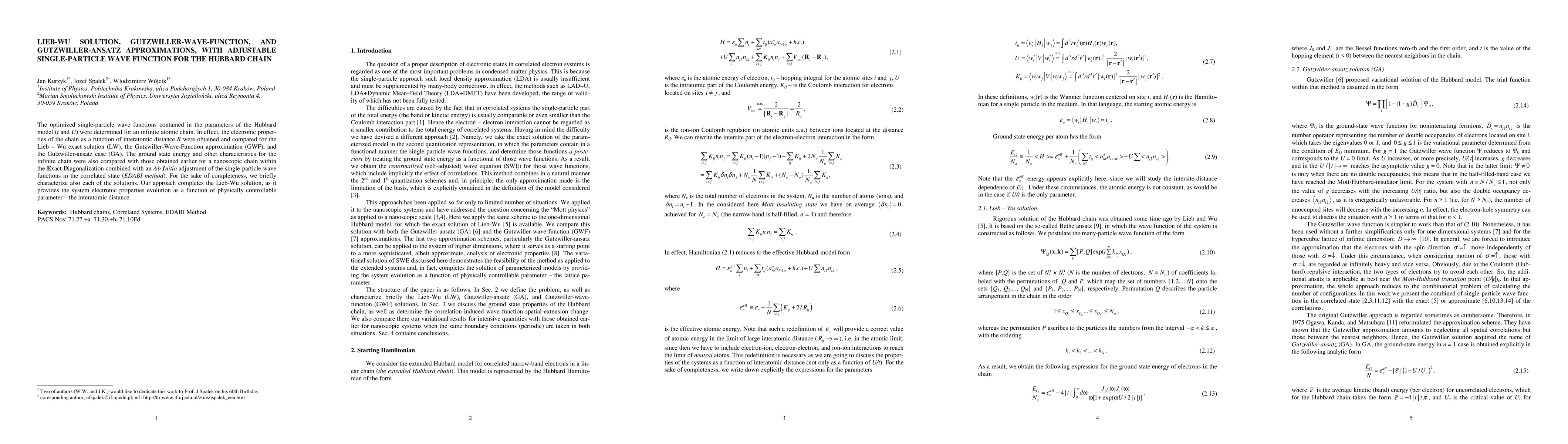 The optimized single-particle wave functions contained in the parameters of the Hubbard model (t and U) were determined for an infinite atomic chain. In effect, the electronic properties of the chain as a function of interatomic distance R were obtained and compared for the Lieb - Wu exact solution (LW), the Gutzwiller-Wave-Function approximation (GWF), and the Gutzwiller-ansatz case (GA). The ground state energy and other characteristics for the infinite chain were also compared with those obtained earlier for a nanoscopic chain within the Exact Diagonalization combined with an Ab Initio adjustment of the single-particle wave functions in the correlated state (EDABI method). For the sake of completeness, we briefly characterize also each of the solutions. Our approach completes the Lieb-Wu solution, as it provides the system electronic properties evolution as a function of physically controllable parameter - the interatomic distance.