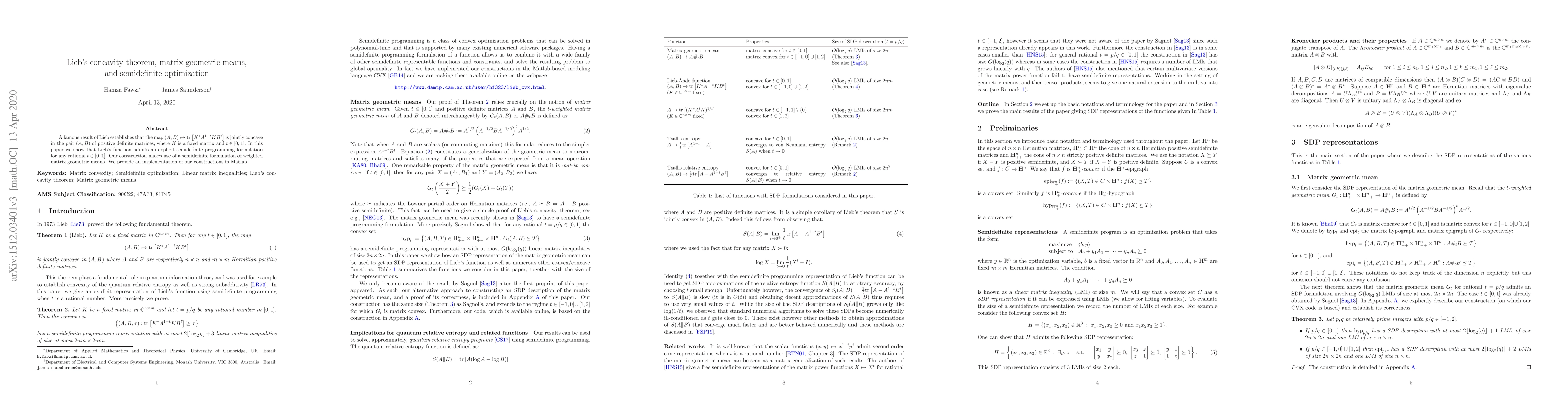 This paper provides an explicit semidefinite programming formulation for Lieb's concavity theorem using matrix geometric means, enabling efficient optimization for rational values of t.
