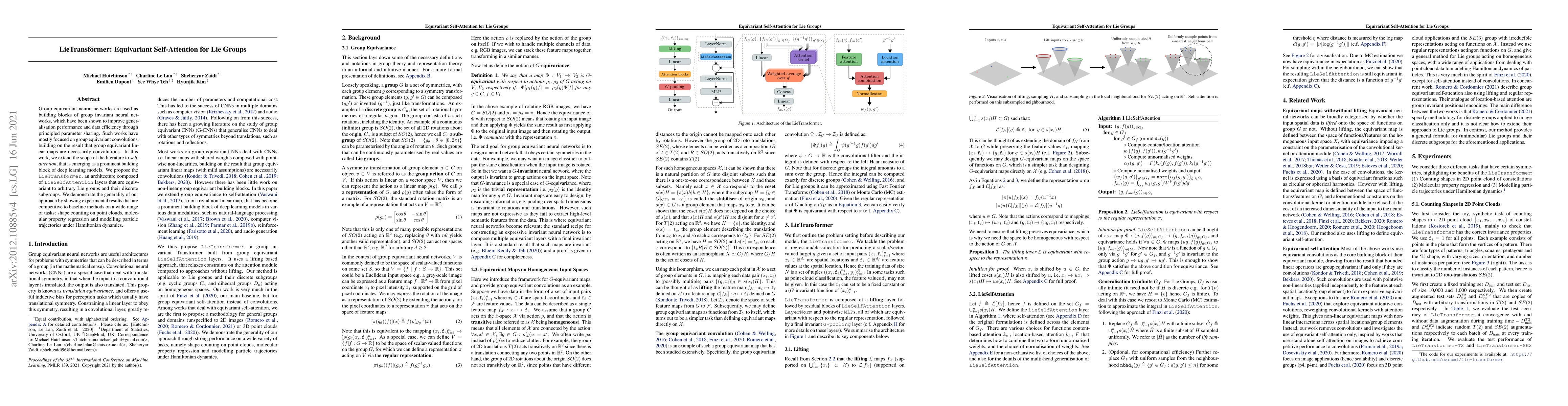 The LieTransformer introduces LieSelfAttention layers for equivariant self-attention on Lie groups, demonstrating competitive performance across tasks like shape counting, molecular property regression, and particle trajectory modeling. This approach extends group equivariance to self-attention mechanisms.