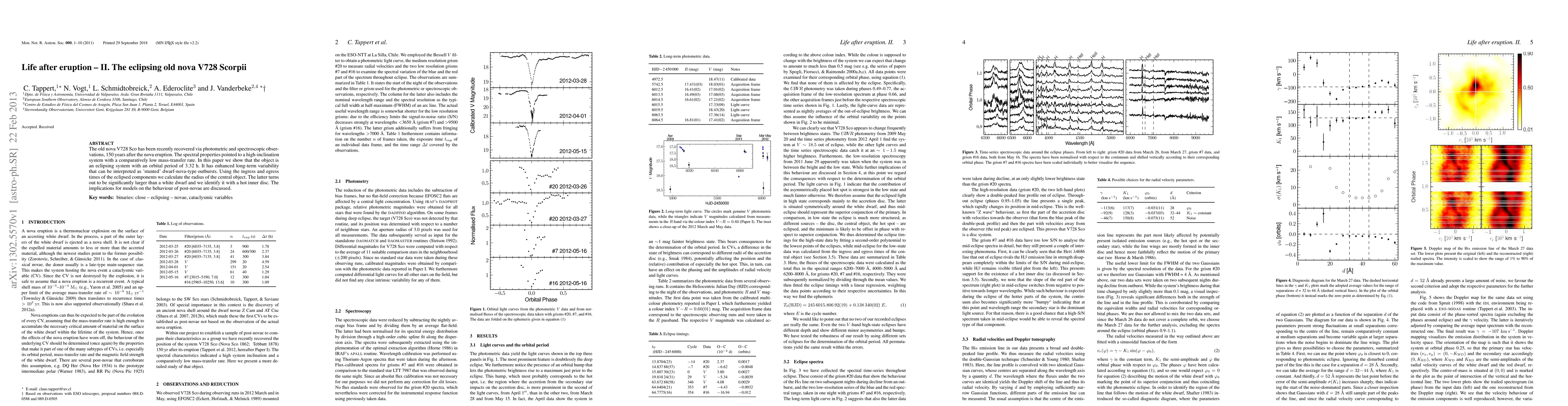 The old nova V728 Sco has been recently recovered via photometric and spectroscopic observations, 150 years after the nova eruption. The spectral properties pointed to a high-inclination system with a comparatively low mass-transfer rate. In this paper we show that the object is an eclipsing system with an orbital period of 3.32 h. It has enhanced long-term variability that can be interpreted as 'stunted' dwarf-nova-type outbursts. Using the ingress and egress times of the eclipsed components we calculate the radius of the central object. The latter turns out to be significantly larger than a white dwarf and we identify it with a hot inner disc. The implications for models on the behaviour of post-novae are discussed.