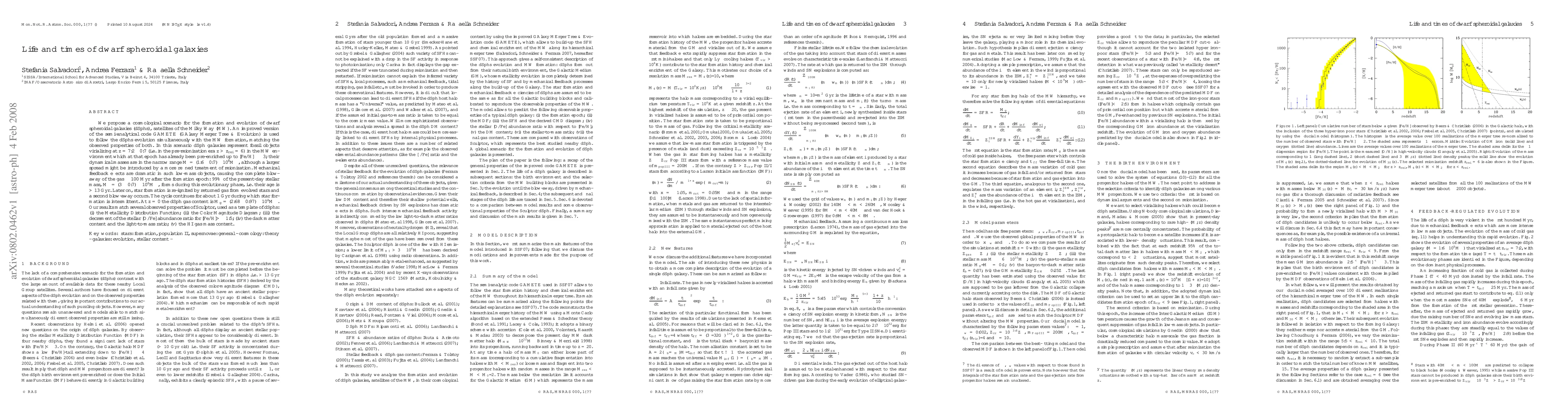 We propose a cosmological scenario for the formation and evolution of dwarf spheroidal galaxies (dSphs), satellites of the Milky Way (MW). An improved version of the semi-analytical code GAMETE (GAlaxy Merger Tree & Evolution) is used to follow the dSphs evolution simultaneously with the MW formation, matching the observed properties of both. In this scenario dSph galaxies represent fossil objects virializing at z = 7.2 +/- 0.7 (i.e. in the pre-reionization era z > z_rei = 6) in the MW environment, which at that epoch has already been pre-enriched up to [Fe/H] ~ -3; their dynamical masses are in the narrow range M = (1.6 +/- 0.7) x 10^8 M_sun, although a larger spread might be introduced by a more refined treatment of reionization. Mechanical feedback effects are dramatic in such low-mass objects, causing the complete blow-away of the gas ~100 Myr after the formation epoch: 99% of the present-day stellar mass, M_* = (3 +/- 0.7) x 10^6 M_sun, forms during this evolutionary phase, i.e. their age is >13 Gyr. Later on, star formation is re-ignited by returned gas from evolved stars and a second blow-away occurs. The cycle continues for about 1 Gyr during which star formation is intermittent. At z = 0 the dSph gas content is M_g = (2.68 +/- 0.97) x 10^4 M_sun. Our results match several observed properties of Sculptor, used as a template of dSphs: (i) the Metallicity Distribution Function; (ii) the Color Magnitude Diagram; (iii) the decrement of the stellar [O/Fe] abundance ratio for [Fe/H] > -1.5; (iv) the dark matter content and the light-to-mass ratio; (v) the HI gas mass content.