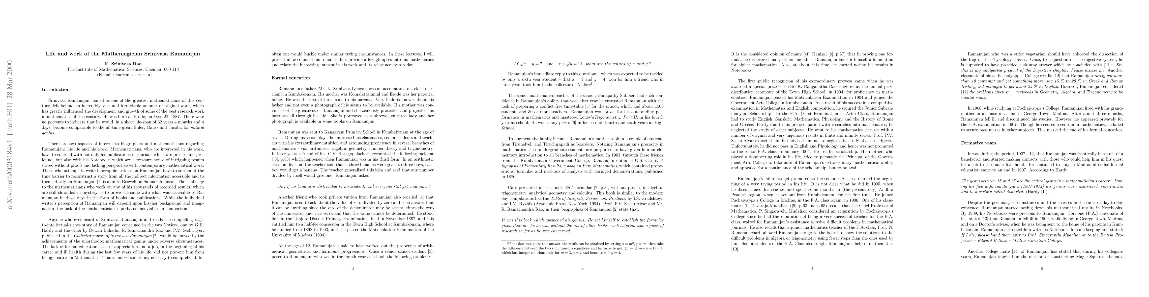 The Life of Srinivasa Ramanujan (1887 - 1920), the renowned Indian Mathematician, is presented, in this the first of a series of lectures, delivered at the Indian Institute for Advanced Study, Shimla.