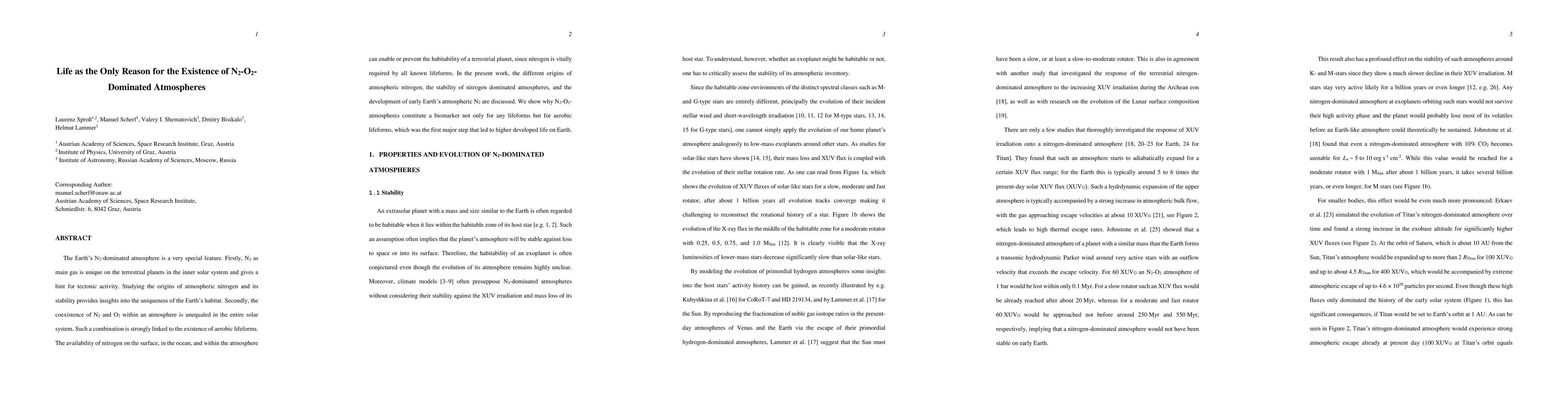 The Earth's N2-dominated atmosphere is a very special feature. Firstly, N2 as main gas is unique on the terrestrial planets in the inner solar system and gives a hint for tectonic activity. Studying the origins of atmospheric nitrogen and its stability provides insights into the uniqueness of the Earth's habitat. Secondly, the coexistence of N2 and O2 within an atmosphere is unequaled in the entire solar system. Such a combination is strongly linked to the existence of aerobic lifeforms. The availability of nitrogen on the surface, in the ocean, and within the atmosphere can enable or prevent the habitability of a terrestrial planet, since nitrogen is vitally required by all known lifeforms. In the present work, the different origins of atmospheric nitrogen, the stability of nitrogen dominated atmospheres, and the development of early Earth's atmospheric N2 are discussed. We show why N2-O2-atmospheres constitute a biomarker not only for any lifeforms but for aerobic lifeforms, which was the first major step that led to higher developed life on Earth.